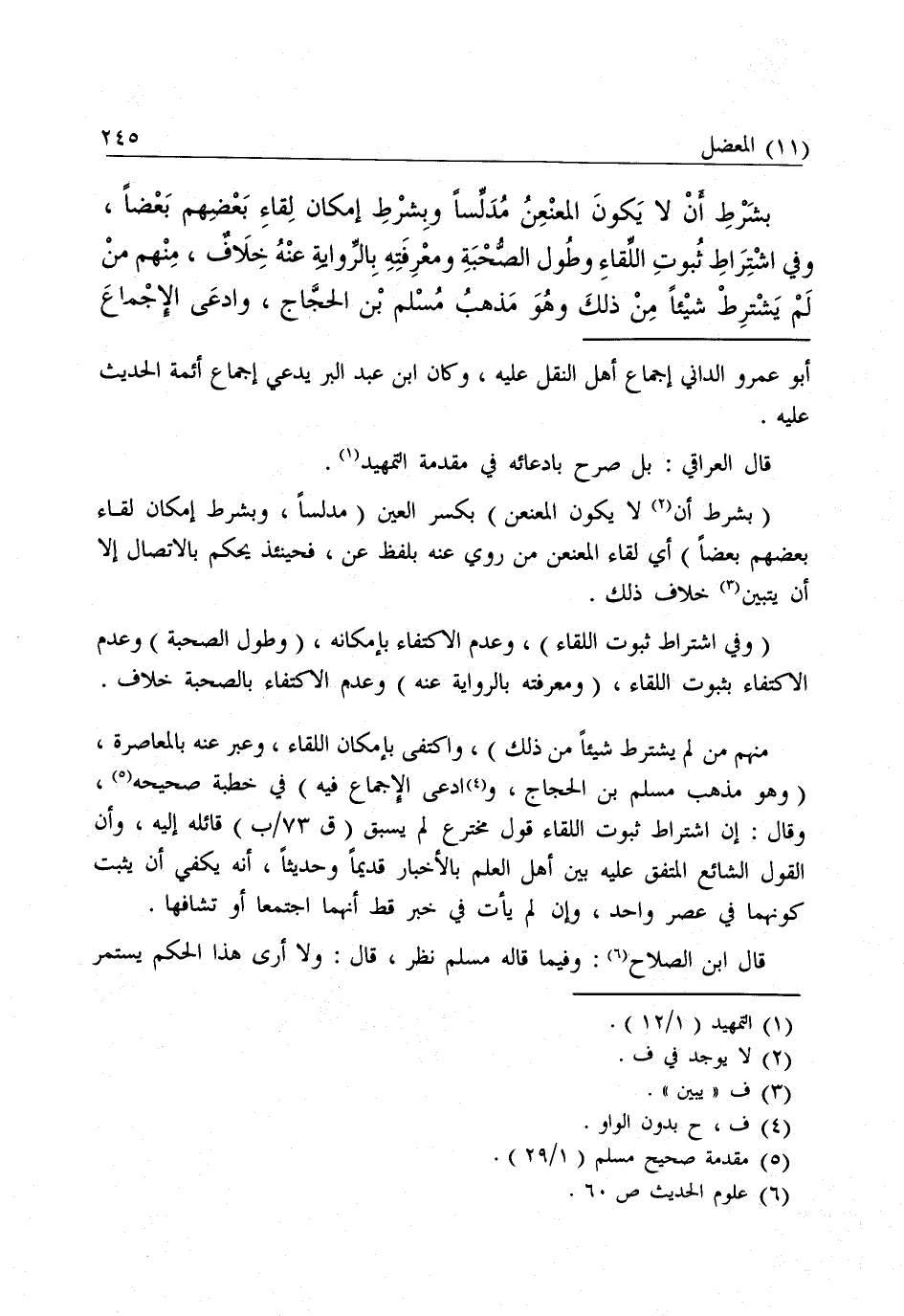 (وَفِي اشْتِرَاطِ ثُبُوتِ اللِّقَاءِ) ، وَعَدَمِ الِاكْتِفَاءِ بِإِمْكَانِهِ، (وَطُولِ الصُّحْبَةِ) ، وَعَدَمِ الِاكْتِفَاءِ بِثُبُوتِ اللِّقَاءِ، (وَمَعْرِفَتِهِ بِالرِّوَايَةِ عَنْهُ) ، وَعَدَمُ الِاكْتِفَاءِ بِالصُّحْبَةِ خِلَافٌ: مِنْهُمْ مَنْ لَمْ يَشْتَرِطْ شَيْئًا مِنْ ذَلِكَ) ، وَاكْتَفَى بِإِمْكَانِ اللِّقَاءِ، وَعَبَّرَ عَنْهُ بِالْمُعَاصَرَةِ، (وَهُوَ مَذْهَبُ مُسْلِمِ بْنِ الْحَجَّاجِ، وَادَّعَى الْإِجْمَاعَ فِيهِ) فِي خُطْبَةِ صَحِيحِهِ، وَقَالَ إِنَّ اشْتِرَاطَ ثُبُوتِ اللِّقَاءِ قَوْلٌ مُخْتَرَعٌ لَمْ يُسْبَقْ (ق 73 \ ب) قَائِلُهُ إِلَيْهِ، وَأَنَّ الْقَوْلَ الشَّائِعَ الْمُتَّفَقَ عَلَيْهِ بَيْنَ أَهْلِ الْعِلْمِ بِالْأَخْبَارِ قَدِيمًا وَحَدِيثًا، أَنَّهُ يَكْفِي أَنْ يَثْبُتَ كَوْنُهُمَا فِي عَصْرٍ وَاحِدٍ، وَإِنْ لَمْ يَأْتِ فِي خَبَرٍ قَطُّ أَنَّهُمَا اجْتَمَعَا أَوْ تَشَافَهَا.
