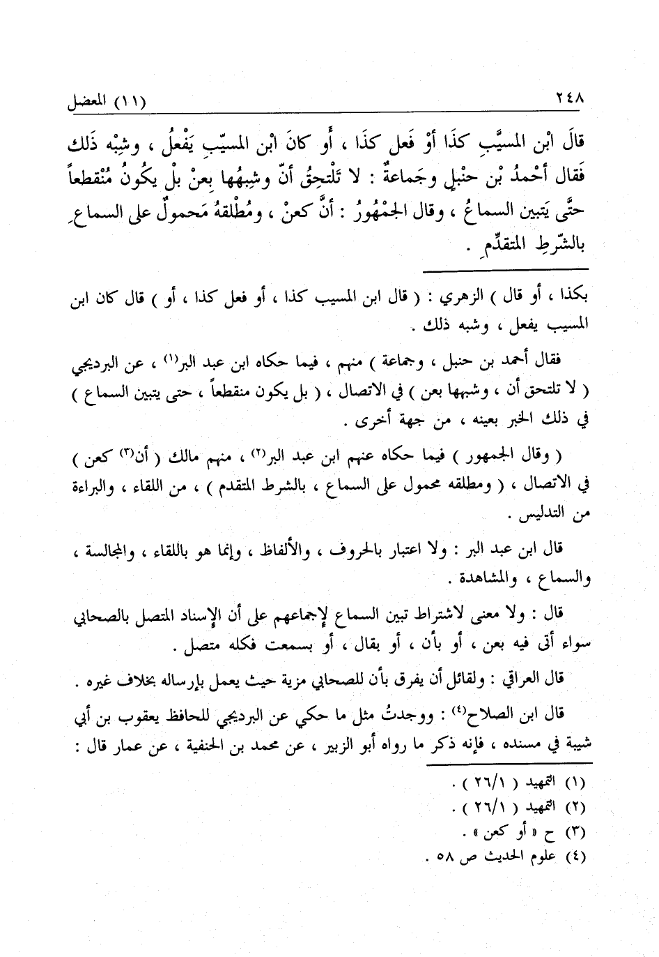 قَالَ: وَلَا مَعْنَى لِاشْتِرَاطِ تَبَيُّنِ السَّمَاعِ لِإِجْمَاعِهِمْ عَلَى أَنَّ الْإِسْنَادَ الْمُتَّصِلَ بِالصَّحَابِيِّ سَوَاءٌ أَتَى فِيهِ بِعَنْ، أَوْ بِأَنَّ، أَوْ بَقَالَ أَوْ بِسَمِعْتُ فَكُلُّهُ مُتَّصِلٌ.