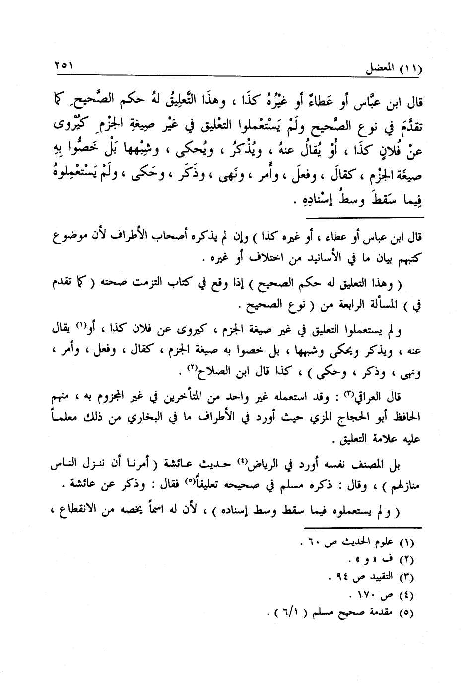 وَلَمْ يَسْتَعْمِلُوا التَّعْلِيقَ فِي غَيْرِ صِيغَةِ الْجَزْمِ، كَيُرْوَى عَنْ فُلَانٍ كَذَا، أَوْ يُقَالُ عَنْهُ، وَيُذْكَرُ وَيُحْكَى وَشِبْهِهَا، بَلْ خَصُّوا بِهِ صِيغَةَ الْجَزْمِ، كَقَالَ وَفَعَلَ، وَأَمَرَ، وَنَهَى، وَذَكَرَ، وَحَكَى) ، كَذَا قَالَ ابْنُ الصَّلَاحِ.