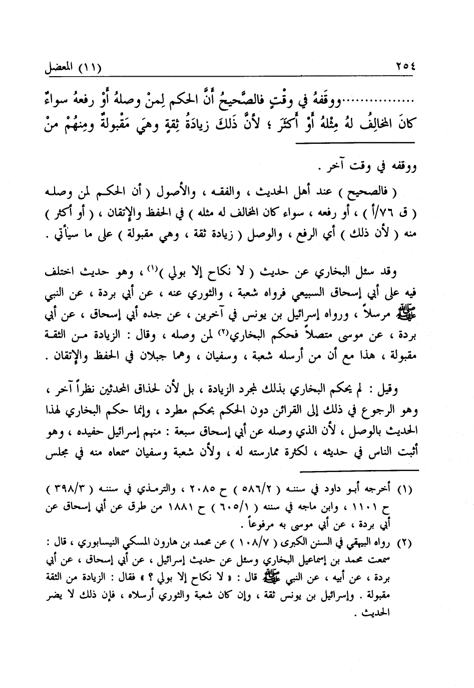 وَقَدْ سُئِلَ الْبُخَارِيُّ، عَنْ حَدِيثِ «لَا نِكَاحَ إِلَّا بِوَلِيٍّ» ، وَهُوَ حَدِيثٌ اخْتُلِفَ فِيهِ عَلَى أَبِي إِسْحَاقَ السَّبِيعِيِّ فَرَوَاهُ شُعْبَةُ، وَالثَّوْرِيُّ عَنْهُ، عَنْ أَبِي بُرْدَةَ، عَنِ النَّبِيِّ - صَلَّى اللَّهُ عَلَيْهِ وَسَلَّمَ - مُرْسَلًا، وَرَوَاهُ إِسْرَائِيلُ بْنُ يُونُسَ فِي آخَرِينَ، عَنْ جَدِّهِ أَبِي إِسْحَاقَ، عَنْ أَبِي بُرْدَةَ، عَنْ مُوسَى مُتَّصِلًا، فَحَكَمَ الْبُخَارِيُّ لِمَنْ وَصَلَهُ، وَقَالَ: الزِّيَادَةُ مِنَ الثِّقَةِ مَقْبُولَةٌ، هَذَا مَعَ أَنَّ مَنْ أَرْسَلَهُ شُعْبَةُ وَسُفْيَانُ، وَهُمَا جَبَلَانِ فِي الْحِفْظِ وَالْإِتْقَانِ.