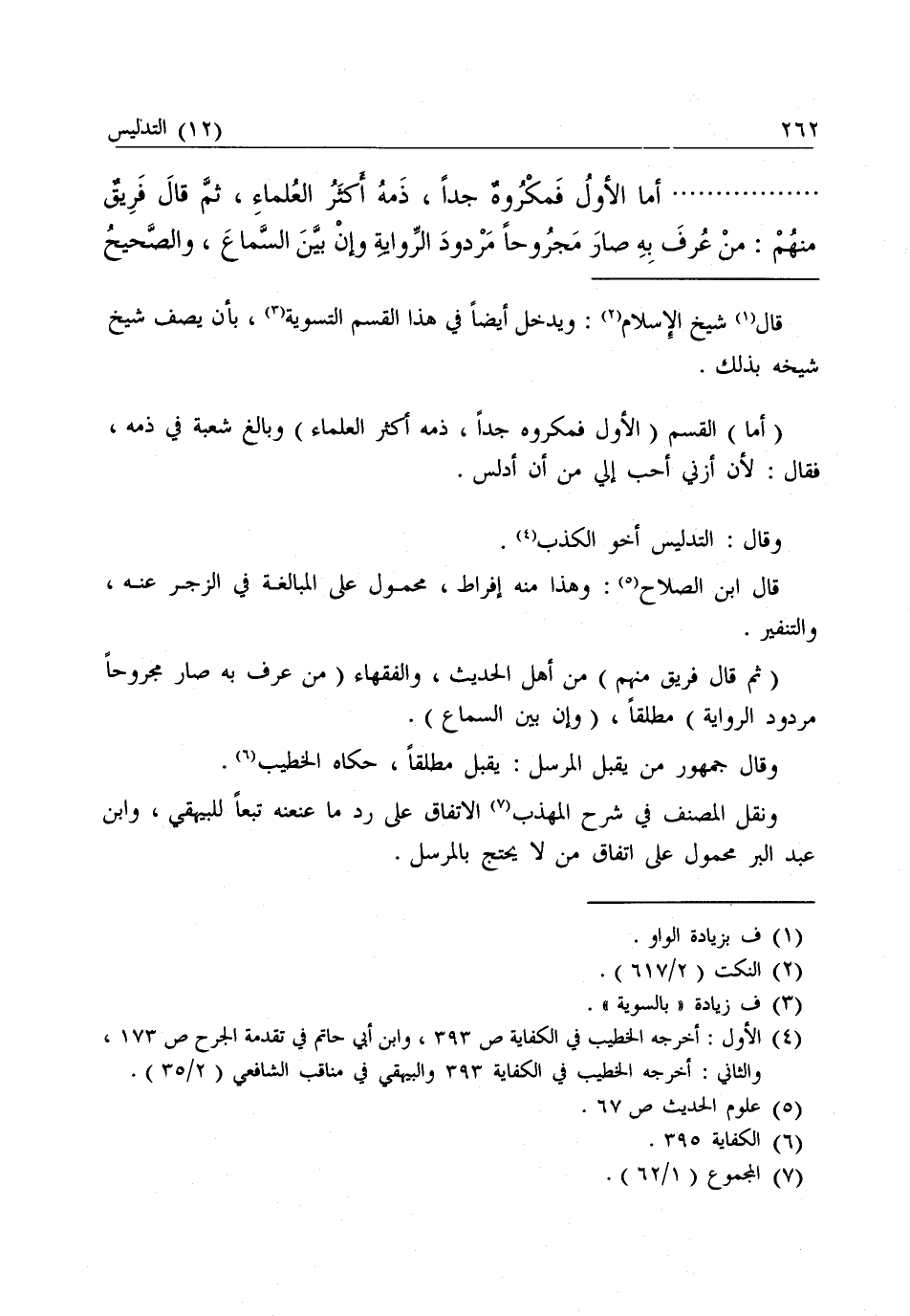 أَمَّا الْأَوَّلُ فَمَكْرُوهٌ جِدًّا، ذَمَّهُ أَكْثَرُ الْعُلَمَاءِ، ثُمَّ قَالَ فَرِيقٌ مِنْهُمْ: مَنْ عُرِفَ بِهِ صَارَ مَجْرُوحًا مَرْدُودَ الرِّوَايَةِ وَإِنْ بَيَّنَ السَّمَاعَ، وَالصَّحِيحُ التَّفْصِيلُ، فَمَا رَوَاهُ بِلَفْظٍ مُحْتَمِلٍ لَمْ يُبَيِّنْ فِيهِ السَّمَاعَ فَمُرْسَلٌ، وَمَا بَيَّنَهُ فِيهِ كَسَمِعْتُ، وَحَدَّثَنَا، وَأَخْبَرَنَا وَشِبْهِهَا فَمَقْبُولٌ مُحْتَجٌّ بِهِ، وَفِي الصَّحِيحَيْنِ وَغَيْرِهِمَا مِنْ هَذَا الضَّرْبِ كَثِيرٌ، كَقَتَادَةَ، وَالسُّفْيَانَيْنِ وَغَيْرِهِمْ، وَهَذَا الْحُكْمُ جَارٍ فِيمَنْ دَلَّسَ مَرَّةً، وَمَا كَانَ فِي الصَّحِيحَيْنِ وَشِبْهِهِمَا، عَنِ الْمُدَلِّسِينَ بِعَنْ مَحْمُولٌ عَلَى ثُبُوتِ السَّمَاعِ مِنْ جِهَةٍ أُخْرَى، وَأَمَّا الثَّانِي فَكَرَاهَتُهُ أَخَفُّ، وَسَبَبُهَا تَوْعِيرُ طَرِيقِ مَعْرِفَتِهِ، وَتَخْتَلِفُ الْحَالُ فِي كَرَاهَتِهِ بِحَسَبِ غَرَضِهِ، لِكَوْنِ الْمُغَيَّرِ اسْمُهُ ضَعِيفًا، أَوْ صَغِيرًا، أَوْ مُتَأَخِّرَ الْوَفَاةِ، أَوْ سَمِعَ مِنْهُ كَثِيرًا، فَامْتَنَعَ مِنْ تَكْرَارِهِ عَلَى صُورَةٍ، وَتَسَمَّحَ الْخَطِيبُ وَغَيْرُهُ بِهَذَا.