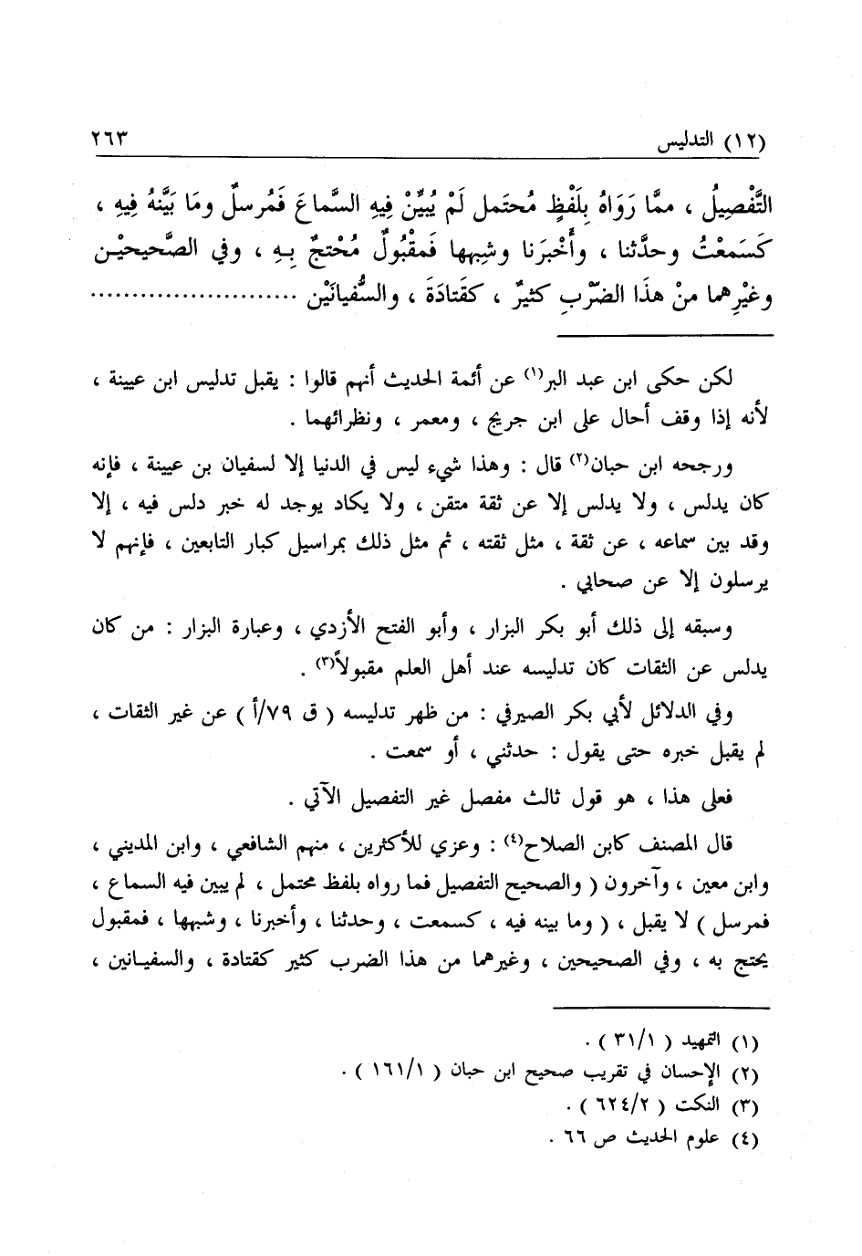 قَالَ الْمُصَنِّفُ كَابْنِ الصَّلَاحِ: وَعَزَى لِلْأَكْثَرِينَ مِنْهُمُ الشَّافِعِيُّ وَابْنُ الْمَدِينِيِّ، وَابْنُ مَعِينٍ وَآخَرُونَ (وَالصَّحِيحُ التَّفْصِيلُ فَمَا رَوَاهُ بِلَفْظٍ مُحْتَمِلٍ، لَمْ يُبَيِّنْ فِيهِ السَّمَاعَ، فَمُرْسَلٌ) لَا يُقْبَلُ، (وَمَا بَيَّنَ فِيهِ كَسَمِعْتُ، وَحَدَّثَنَا، وَأَخْبَرَنَا، وَشِبْهِهَا، فَمَقْبُولٌ يُحْتَجُّ بِهِ، وَفِي الصَّحِيحَيْنِ، وَغَيْرِهِمَا مِنْ هَذَا الضَّرْبِ كَثِيرٌ كَقَتَادَةَ وَالسُّفْيَانَيْنِ