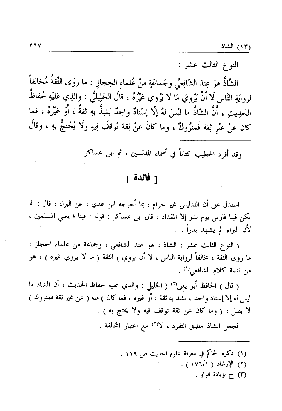 النَّوْعُ الثَّالِثَ عَشَرَ: الشَّاذُّ هُوَ عِنْدَ الشَّافِعِيِّ وَجَمَاعَةٍ مِنْ عُلَمَاءِ الْحِجَازِ: مَا رَوَى الثِّقَةُ مُخَالِفًا لِرِوَايَةِ النَّاسِ لَا أَنْ يَرْوِيَ مَا لَا يَرْوِي غَيْرُهُ، قَالَ الْخَلِيلِيُّ: وَالَّذِي عَلَيْهِ حُفَّاظُ الْحَدِيثِ، أَنَّ الشَّاذَّ مَا لَيْسَ لَهُ إِلَّا إِسْنَادٌ وَاحِدٌ يَشِذُّ بِهِ ثِقَةٌ، أَوْ غَيْرُهُ، فَمَا كَانَ عَنْ غَيْرِ ثِقَةٍ فَمَتْرُوكٌ، وَمَا كَانَ عَنْ ثِقَةٍ تُوُقِّفَ فِيهِ، وَلَا يُحْتَجُّ بِهِ، وَقَالَ الْحَاكِمُ: هُوَ مَا انْفَرَدَ بِهِ ثِقَةٌ وَلَيْسَ لَهُ أَصْلٌ بِمُتَابِعٍ.