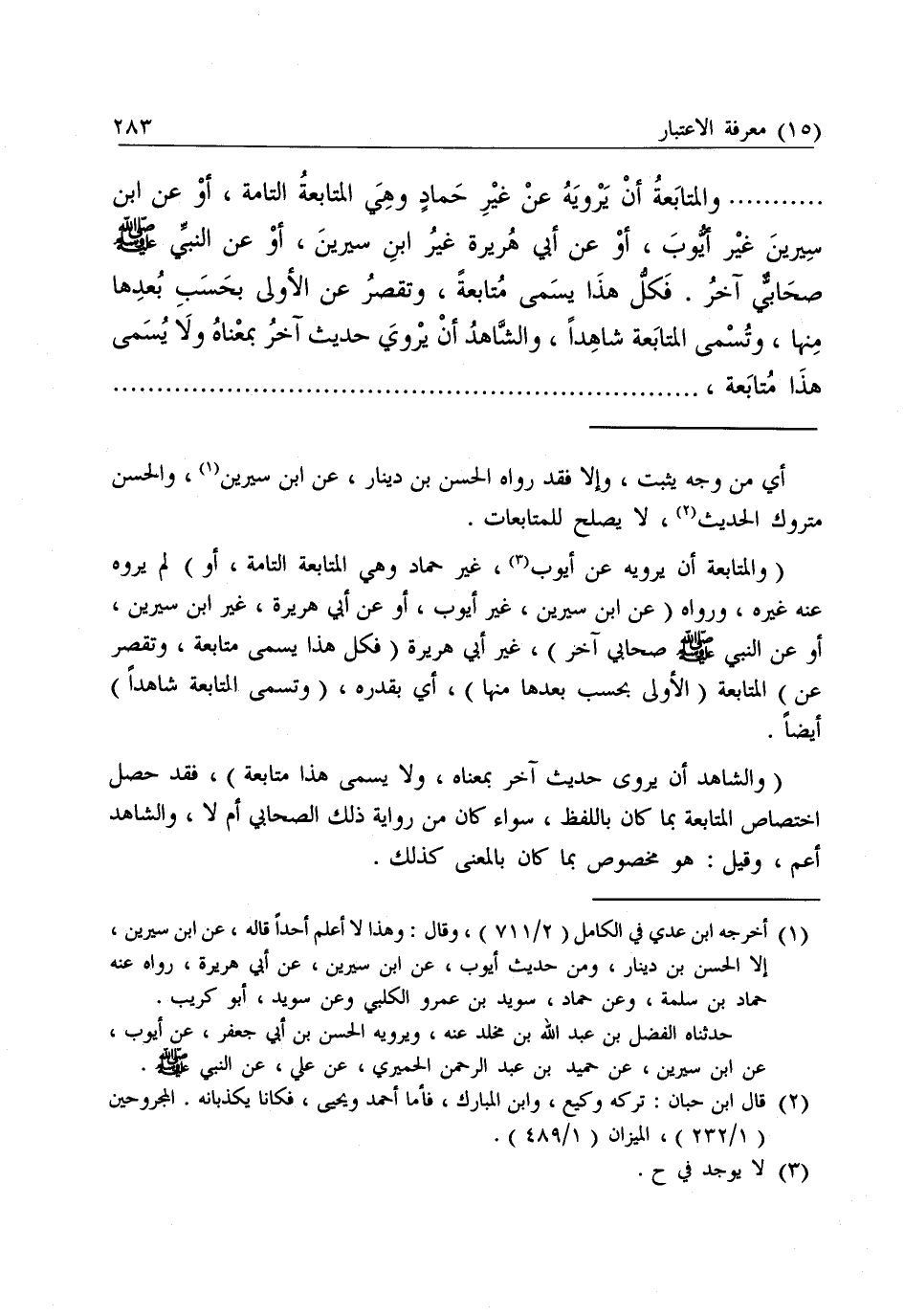 (وَالْمُتَابَعَةُ أَنْ يَرْوِيَهُ، عَنْ أَيُّوبَ غَيْرُ حَمَّادٍ، وَهِيَ الْمُتَابَعَةُ التَّامَّةُ، أَوْ) لَمْ يَرْوِهِ عَنْهُ غَيْرُهُ، وَرَوَاهُ (، عَنِ ابْنِ سِيرِينَ غَيْرُ أَيُّوبَ أَوْ عَنْ أَبِي هُرَيْرَةَ، غَيْرُ ابْنِ سِيرِينَ أَوْ عَنِ النَّبِيِّ - صَلَّى اللَّهُ عَلَيْهِ وَسَلَّمَ - صَحَابِيٌّ آخَرُ) ، غَيْرُ أَبِي هُرَيْرَةَ (فَكُلُّ هَذَا يُسَمَّى مُتَابَعَةً، وَتَقْصُرُ عَنِ) الْمُتَابَعَةِ (الْأُولَى بِحَسَبِ بُعْدِهَا مِنْهَا) ، أَيْ بِقَدْرِهِ (وَتُسَمَّى الْمُتَابَعَةُ شَاهِدًا) أَيْضًا.
