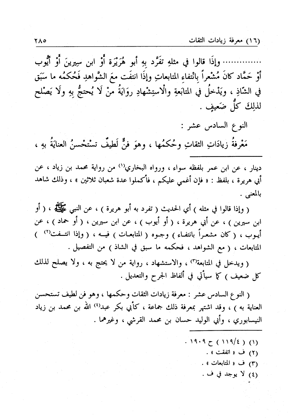 (النَّوْعُ السَّادِسَ عَشَرَ: مَعْرِفَةُ زِيَادَاتِ الثِّقَاتِ وَحُكْمُهَا، وَهُوَ فَنٌّ لَطِيفٌ تُسْتَحْسَنُ الْعِنَايَةُ بِهِ) ، وَقَدِ اشْتَهَرَ بِمَعْرِفَةِ ذَلِكَ جَمَاعَةٌ كَأَبِي بَكْرٍ عَبْدِ اللَّهِ بْنِ مُحَمَّدِ بْنِ زِيَادٍ النَّيْسَابُورِيِّ، وَأَبِي الْوَلِيدِ حَسَّانِ بْنِ مُحَمَّدٍ الْقُرَشِيِّ وَغَيْرِهِمَا.