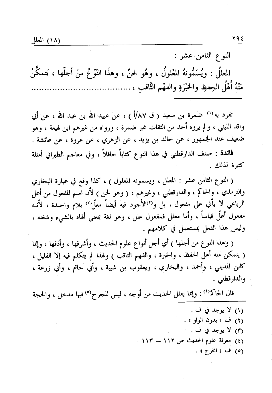 النَّوْعُ الثَّامِنَ عَشَرَ: الْمُعَلَّلُ: وَيُسَمُّونَهُ الْمَعْلُولَ، وَهُوَ لَحْنٌ، وَهَذَا النَّوْعُ مِنْ أَجَلِّهَا، يَتَمَكَّنُ مِنْهُ أَهْلُ الْحِفْظِ وَالْخِبْرَةِ وَالْفَهْمِ الثَّاقِبِ، وَالْعِلَّةُ عِبَارَةٌ عَنْ سَبَبٍ غَامِضٍ خَفِيٍّ قَادِحٍ مَعَ أَنَّ الظَّاهِرَ السَّلَامَةُ مِنْهُ. .