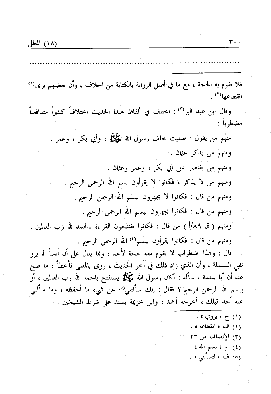 قَالَ: وَهَذَا اضْطِرَابٌ لَا تَقُومُ مَعَهُ حُجَّةٌ لِأَحَدٍ، وَمِمَّا يَدُلُّ عَلَى أَنَّ أَنَسًا لَمْ يَرْوِ نَفْيَ الْبَسْمَلَةِ، وَأَنَّ الَّذِي زَادَ ذَلِكَ فِي آخِرِ الْحَدِيثِ، رَوَى بِالْمَعْنَى فَأَخْطَأَ، مَا صَحَّ عَنْهُ أَنَّ أَبَا سَلَمَةَ سَأَلَهُ، أَكَانَ رَسُولُ اللَّهِ - صَلَّى اللَّهُ عَلَيْهِ وَسَلَّمَ - يَسْتَفْتِحُ بِـ {الْحَمْدُ لِلَّهِ رَبِّ الْعَالَمِينَ} [الفاتحة: 2] ، أَوْ بِـ {بِسْمِ اللَّهِ الرَّحْمَنِ الرَّحِيمِ} [الفاتحة: 1] ؟ فَقَالَ: إِنَّكَ سَأَلْتَنِي عَنْ شَيْءٍ مَا أَحْفَظُهُ، وَمَا سَأَلَنِي عَنْهُ أَحَدٌ قَبْلَكَ، أَخْرَجَهُ أَحْمَدُ، وَابْنُ خُزَيْمَةَ بِسَنَدٍ عَلَى شَرْطِ الشَّيْخَيْنِ.