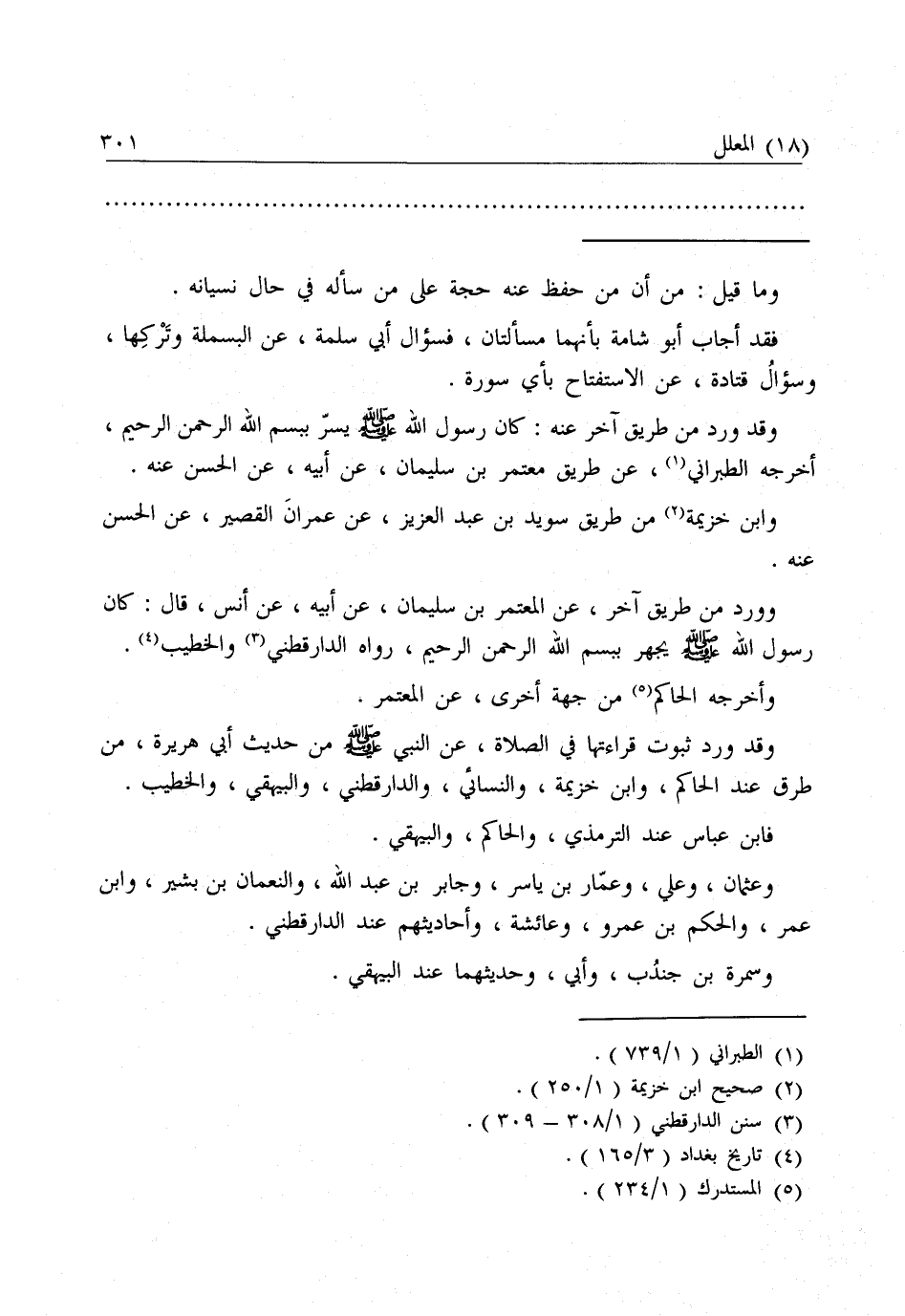 ـــــــــــــــــــــــــــــQوَمَا قِيلَ: مِنْ أَنَّ مَنْ حَفِظَ عَنْهُ حُجَّةٌ عَلَى مَنْ سَأَلَهُ فِي حَالِ نِسْيَانِهِ، فَقَدْ أَجَابَ أَبُو شَامَةَ بِأَنَّهُمَا مَسْأَلَتَانِ، فَسُؤَالُ أَبِي سَلَمَةَ عَنِ الْبَسْمَلَةِ، وَتَرْكِهَا، وَسُؤَالُ قَتَادَةَ عَنِ الِاسْتِفْتَاحِ بِأَيِّ سُورَةٍ.