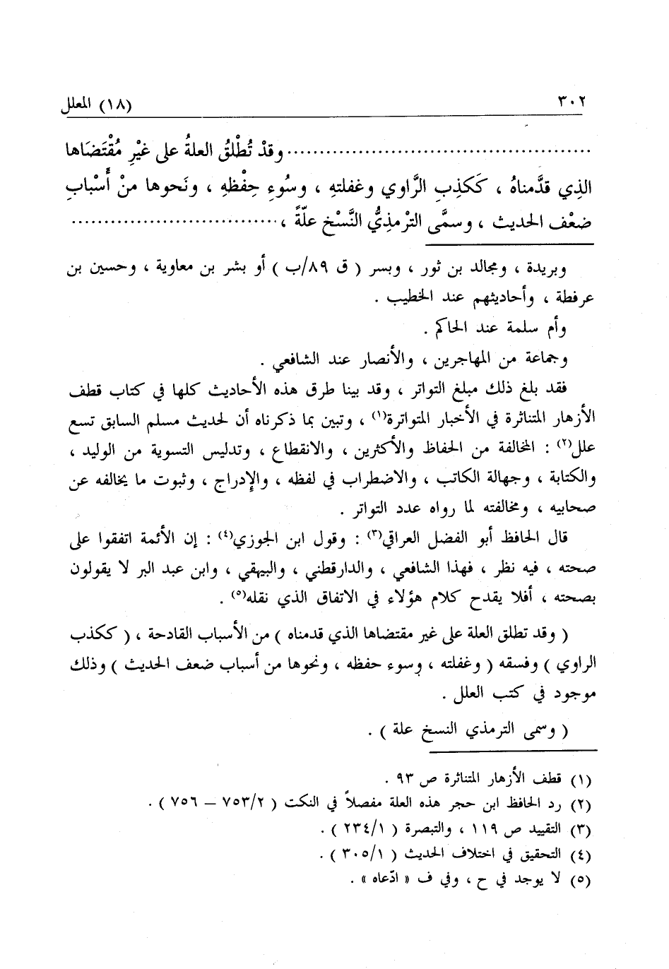وَقَدْ تُطْلَقُ الْعِلَّةُ عَلَى غَيْرِ مُقْتَضَاهَا الَّذِي قَدَّمْنَاهُ، كَكَذِبِ الرَّاوِي، وَغَفْلَتِهِ، وَسُوءِ حِفْظِهِ وَنَحْوِهَا مِنْ أَسْبَابِ ضَعْفِ الْحَدِيثِ، وَسَمَّى التِّرْمِذِيُّ النَّسْخَ عِلَّةً وَأَطْلَقَ بَعْضُهُمُ الْعِلَّةَ عَلَى مُخَالَفَةٍ لَا تَقْدَحُ كَإِرْسَالِ مَا وَصَلَهُ الثِّقَةُ الضَّابِطُ حَتَّى قَالَ: مِنَ الصَّحِيحِ صَحِيحٌ مُعَلَّلٌ كَمَا قِيلَ مِنْهُ صَحِيحٌ شَاذٌّ.