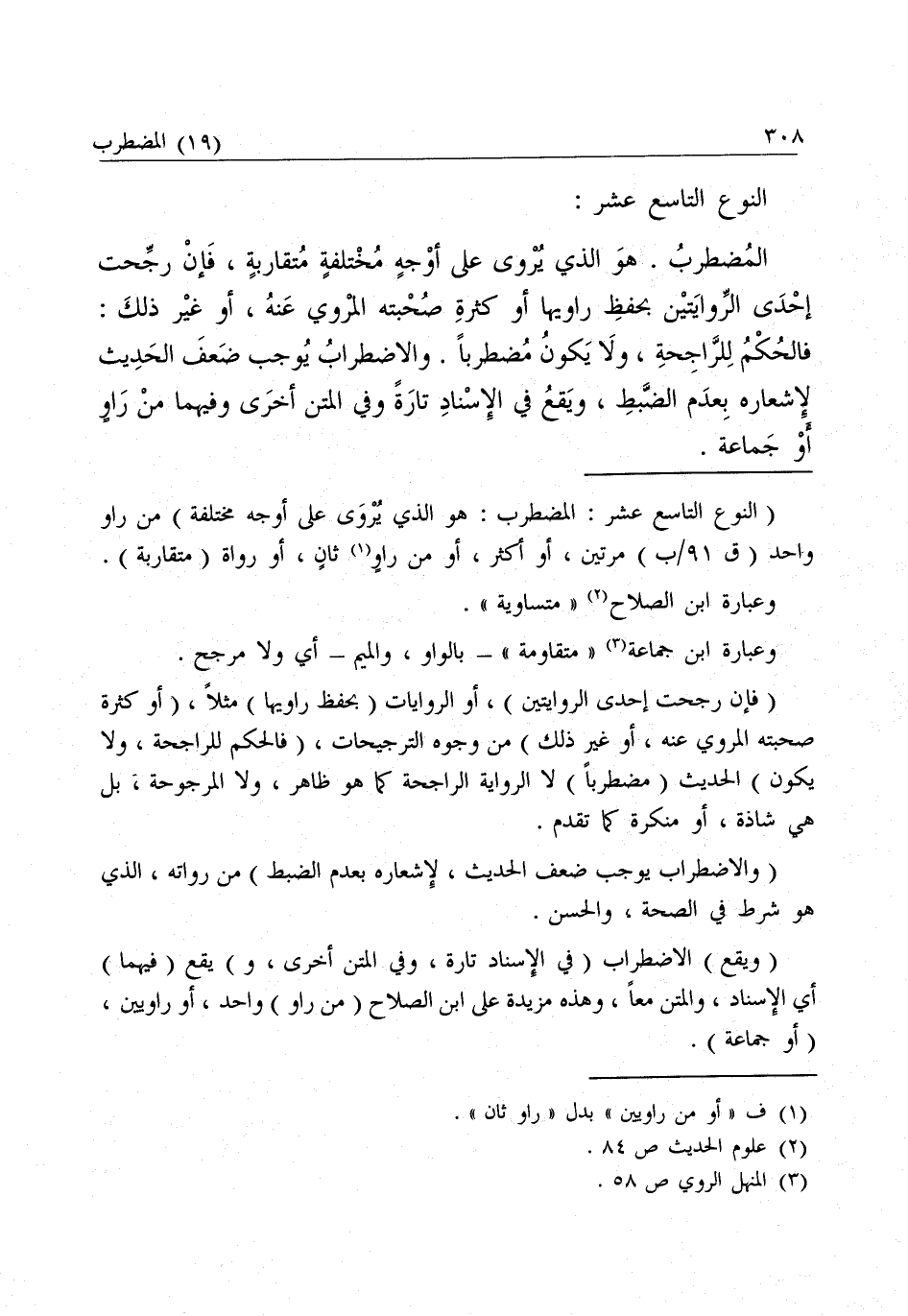 (النَّوْعُ التَّاسِعَ عَشَرَ: الْمُضْطَرِبُ: هُوَ الَّذِي يُرْوَى عَلَى أَوْجُهٍ مُخْتَلِفَةٍ) مِنْ رَاوٍ وَاحِدٍ مَرَّتَيْنِ، أَوْ أَكْثَرَ، أَوْ مِنْ رَاوٍ ثَانٍ، أَوْ رُوَاةٍ (مُتَقَارِبَةٍ) .
