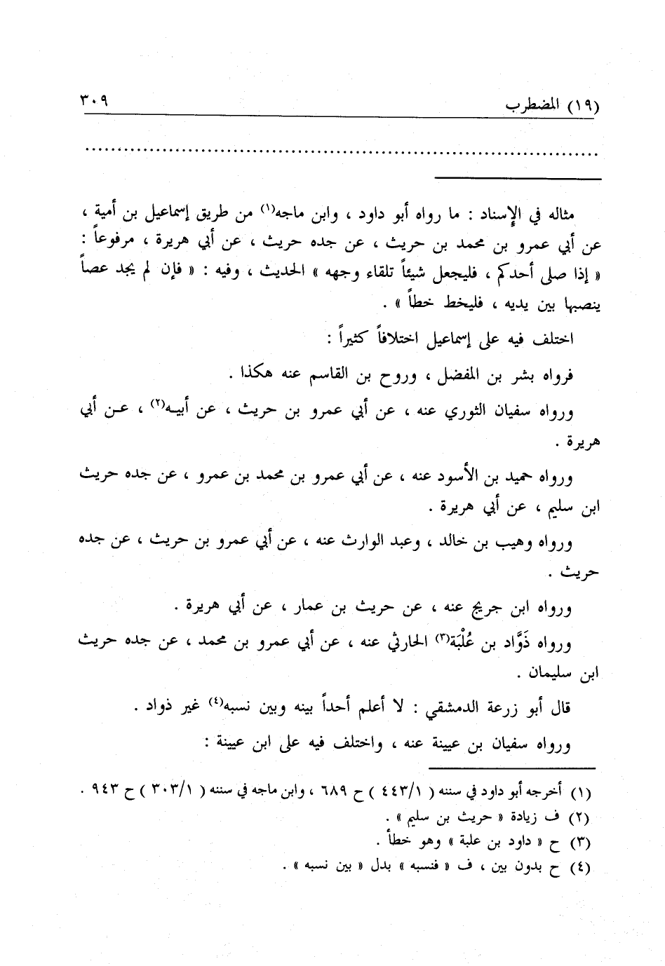 ـــــــــــــــــــــــــــــQمِثَالُهُ فِي الْإِسْنَادِ: مَا رَوَاهُ أَبُو دَاوُدَ، وَابْنُ مَاجَهْ مِنْ طَرِيقِ إِسْمَاعِيلَ بْنِ أُمَيَّةَ، عَنْ أَبِي عَمْرِو بْنِ مُحَمَّدِ بْنِ حُرَيْثٍ، عَنْ جَدِّهِ حُرَيْثٍ، عَنْ أَبِي هُرَيْرَةَ، مَرْفُوعًا: «إِذَا صَلَّى أَحَدُكُمْ، فَلْيَجْعَلْ شَيْئًا تِلْقَاءَ وَجْهِهِ» الْحَدِيثَ، وَفِيهِ: «فَإِنْ لَمْ يَجِدْ عَصًا يَنْصِبُهَا بَيْنَ يَدَيْهِ، فَلْيَخُطَّ خَطًّا» .