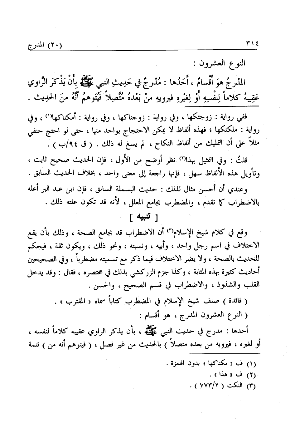 (النَّوْعُ الْعِشْرُونَ الْمُدْرَجُ، هُوَ أَقْسَامٌ: أَحَدُهَا: مُدْرَجٌ فِي حَدِيثِ النَّبِيِّ - صَلَّى اللَّهُ عَلَيْهِ وَسَلَّمَ - بِأَنْ يَذْكُرَ الرَّاوِي عَقِيبَهُ كَلَامًا لِنَفْسِهِ أَوْ لِغَيْرِهِ فَيَرْوِيَهُ مَنْ بَعْدِهِ مُتَّصِلًا) بِالْحَدِيثِ مِنْ غَيْرِ فَصْلٍ (فَيُتَوَهَّمَ أَنَّهُ مِنَ) تَتِمَّةِ