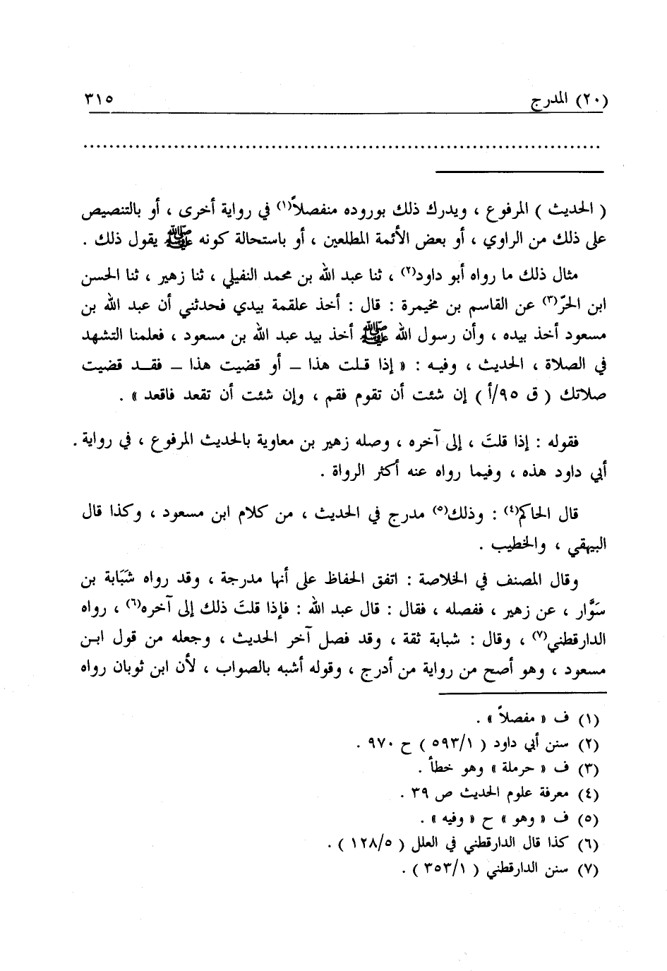 مِثَالُ ذَلِكَ مَا رَوَاهُ أَبُو دَاوُدَ، ثَنَا عُبَيْدُ اللَّهِ بْنُ مُحَمَّدٍ النُّفَيْلِيُّ ثَنَا زُهَيْرٌ، ثَنَا الْحَسَنُ بْنُ الْحُرِّ، عَنِ الْقَاسِمِ بْنِ مُخَيْمِرَةَ: قَالَ أَخَذَ عَلْقَمَةُ بِيَدِي فَحَدَّثَنِي أَنَّ عَبْدَ اللَّهِ بْنَ مَسْعُودٍ أَخَذَ بِيَدِهِ، «وَأَنَّ رَسُولَ اللَّهِ - صَلَّى اللَّهُ عَلَيْهِ وَسَلَّمَ - أَخَذَ بِيَدِ عَبْدِ اللَّهِ بْنِ مَسْعُودٍ، فَعَلَّمَنَا التَّشَهُّدَ فِي الصَّلَاةِ، الْحَدِيثَ، وَفِيهِ: " إِذَا قُلْتَ هَذَا - أَوْ قَضَيْتَ هَذَا - فَقَدْ قَضَيْتَ صَلَاتَكَ إِنْ شِئْتَ أَنْ تَقُومَ فَقُمْ، وَإِنْ شِئْتَ أَنْ تَقْعُدَ فَاقْعُدْ» .