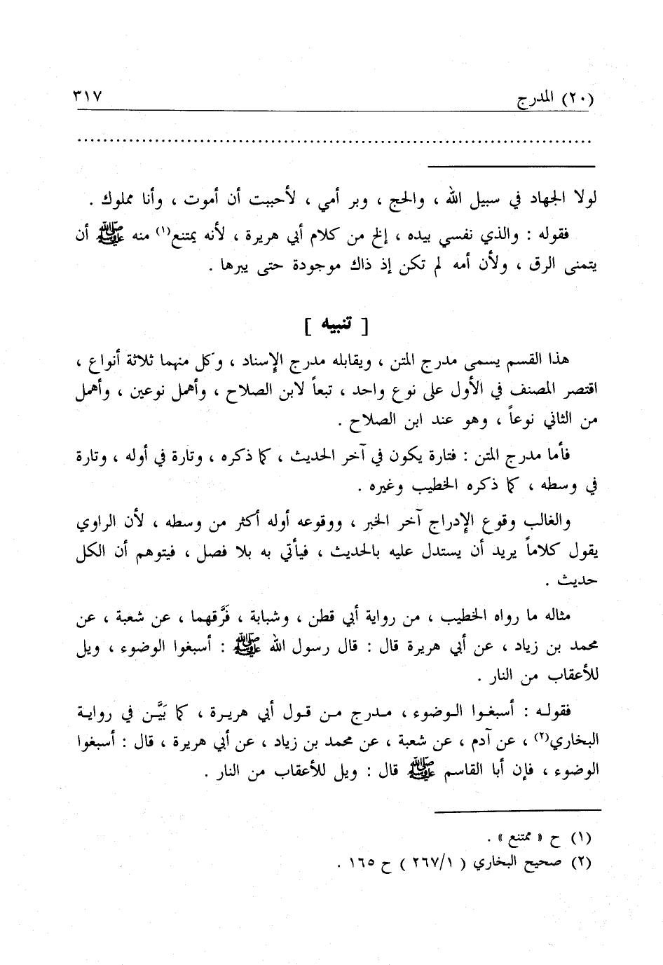 هَذَا الْقِسْمُ يُسَمَّى مُدْرَجَ الْمَتْنِ، وَيُقَابِلُهُ مُدْرَجُ الْإِسْنَادِ، وَكُلٌّ مِنْهُمَا ثَلَاثَةُ أَنْوَاعٍ، اقْتَصَرَ الْمُصَنِّفُ فِي الْأَوَّلِ عَلَى نَوْعٍ وَاحِدٍ تَبَعًا لِابْنِ الصَّلَاحِ، وَأَهْمَلَ نَوْعَيْنِ، وَأَهْمَلَ مِنَ الثَّانِي نَوْعًا، وَهُوَ عِنْدَ ابْنِ الصَّلَاحِ.