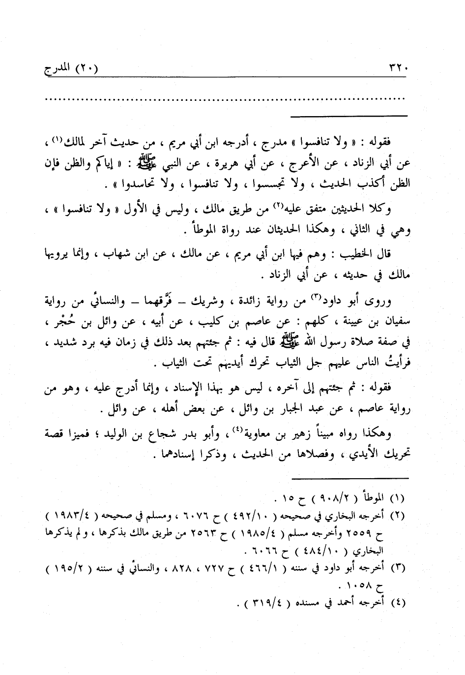 ـــــــــــــــــــــــــــــQفَقَوْلُهُ: «وَلَا تَنَافَسُوا» مُدْرَجٌ، أَدْرَجَهُ ابْنُ أَبِي مَرْيَمَ مِنْ حَدِيثٍ آخَرَ لِمَالِكٍ، عَنْ أَبِي الزِّنَادِ، عَنِ الْأَعْرَجِ، عَنْ أَبِي هُرَيْرَةَ، عَنِ النَّبِيِّ - صَلَّى اللَّهُ عَلَيْهِ وَسَلَّمَ -: «إِيَّاكُمْ وَالظَّنَّ فَإِنَّ الظَّنَّ أَكْذَبُ الْحَدِيثِ، وَلَا تَجَسَّسُوا، وَلَا تَنَافَسُوا، وَلَا تَحَاسَدُوا» .
