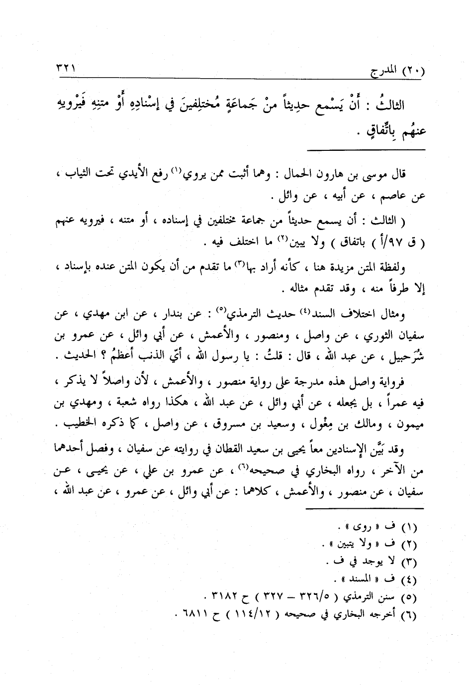فَرِوَايَةُ وَاصِلٍ هَذِهِ مُدْرَجَةٌ عَلَى رِوَايَةِ مَنْصُورٍ وَالْأَعْمَشِ ; لِأَنَّ وَاصِلًا لَا يَذْكُرُ فِيهِ عَمْرًا، بَلْ يَجْعَلُهُ، عَنْ أَبِي وَائِلٍ، عَنْ عَبْدِ اللَّهِ، هَكَذَا رَوَاهُ شُعْبَةُ، وَمَهْدِيُّ بْنُ مَيْمُونٍ، وَمَالِكُ بْنُ مِغْوَلٍ، وَسَعِيدُ بْنُ مَسْرُوقٍ، عَنْ وَاصِلٍ كَمَا ذَكَرَهُ الْخَطِيبُ