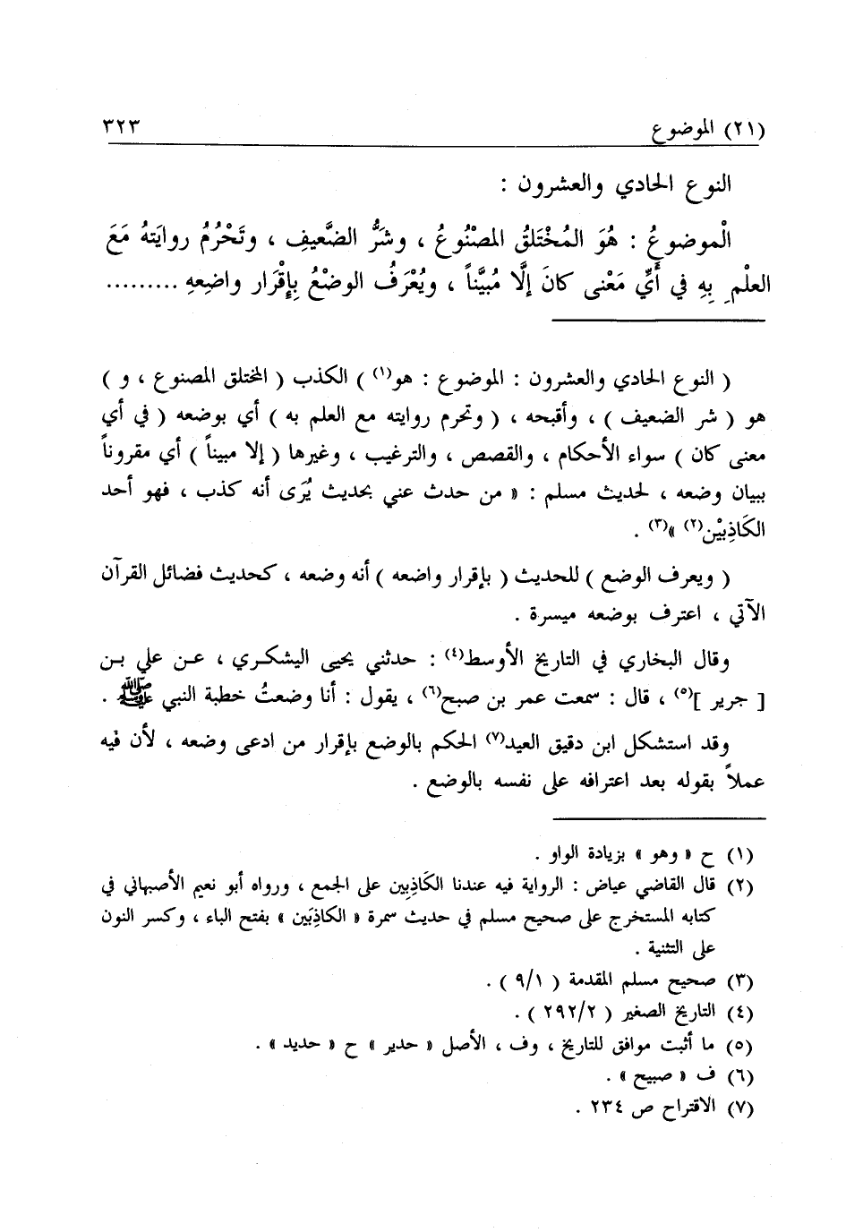 النَّوْعُ الْحَادِي وَالْعِشْرُونَ: الْمَوْضُوعُ: هُوَ الْمُخْتَلَقُ الْمَصْنُوعُ، وَشَرُّ الضَّعِيفِ، وَتَحْرُمُ رِوَايَتُهُ مَعَ الْعِلْمِ بِهِ فِي أَيِّ مَعْنًى كَانَ إِلَّا مُبَيَّنًا، وَيُعْرَفُ الْوَضْعُ بِإِقْرَارِ وَاضِعِهِ. أَوْ مَعْنَى إِقْرَارِهِ، أَوْ قَرِينَةٍ فِي الرَّاوِي أَوِ الْمَرْوِيِّ، فَقَدْ وُضِعَتْ أَحَادِيثُ يَشْهَدُ بِوَضْعِهَا رَكَاكَةُ لَفْظِهَا وَمَعَانِيهَا.