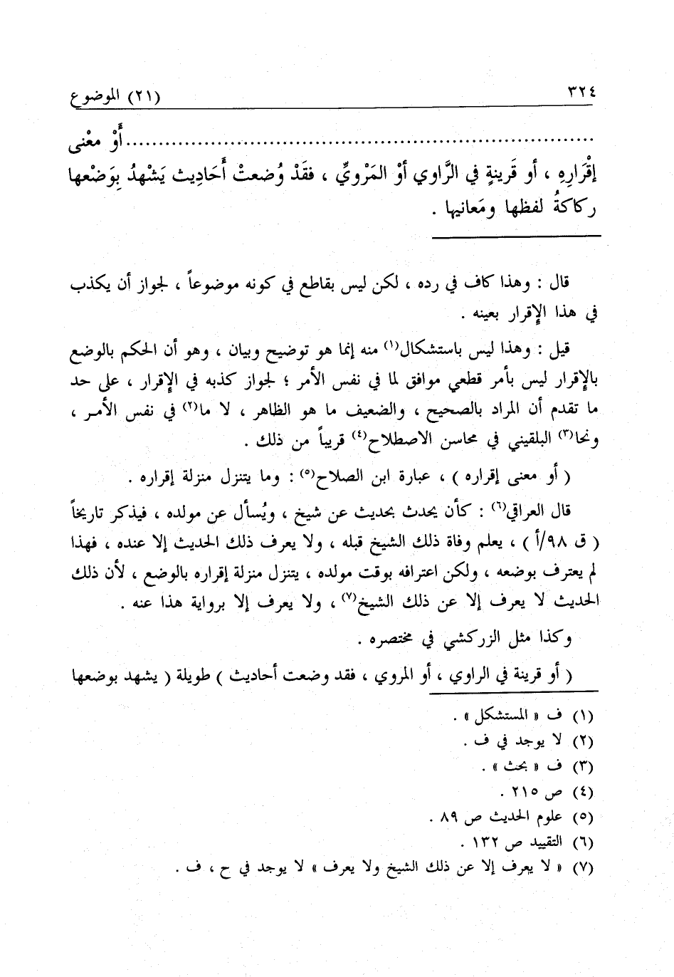 قَالَ الْعِرَاقِيُّ: كَأَنْ يُحَدِّثَ بِحَدِيثٍ عَنْ شَيْخٍ، وَيُسْأَلَ عَنْ مَوْلِدِهِ، فَيَذْكُرَ تَارِيخًا يُعْلَمُ وَفَاةُ ذَلِكَ الشَّيْخِ قَبْلَهُ، وَلَا يُعْرَفُ ذَلِكَ الْحَدِيثُ إِلَّا عِنْدَهُ، فَهَذَا لَمْ يَعْتَرِفْ بِوَضْعِهِ، وَلَكِنَّ اعْتِرَافَهُ بِوَقْتِ مَوْلِدِهِ يَتَنَزَّلُ مَنْزِلَةَ إِقْرَارِهِ بِالْوَضْعِ ; لِأَنَّ ذَلِكَ الْحَدِيثَ لَا يُعْرَفُ إِلَّا عَنْ ذَلِكَ الشَّيْخِ، وَلَا يُعْرَفُ إِلَّا بِرِوَايَةِ هَذَا عَنْهُ.