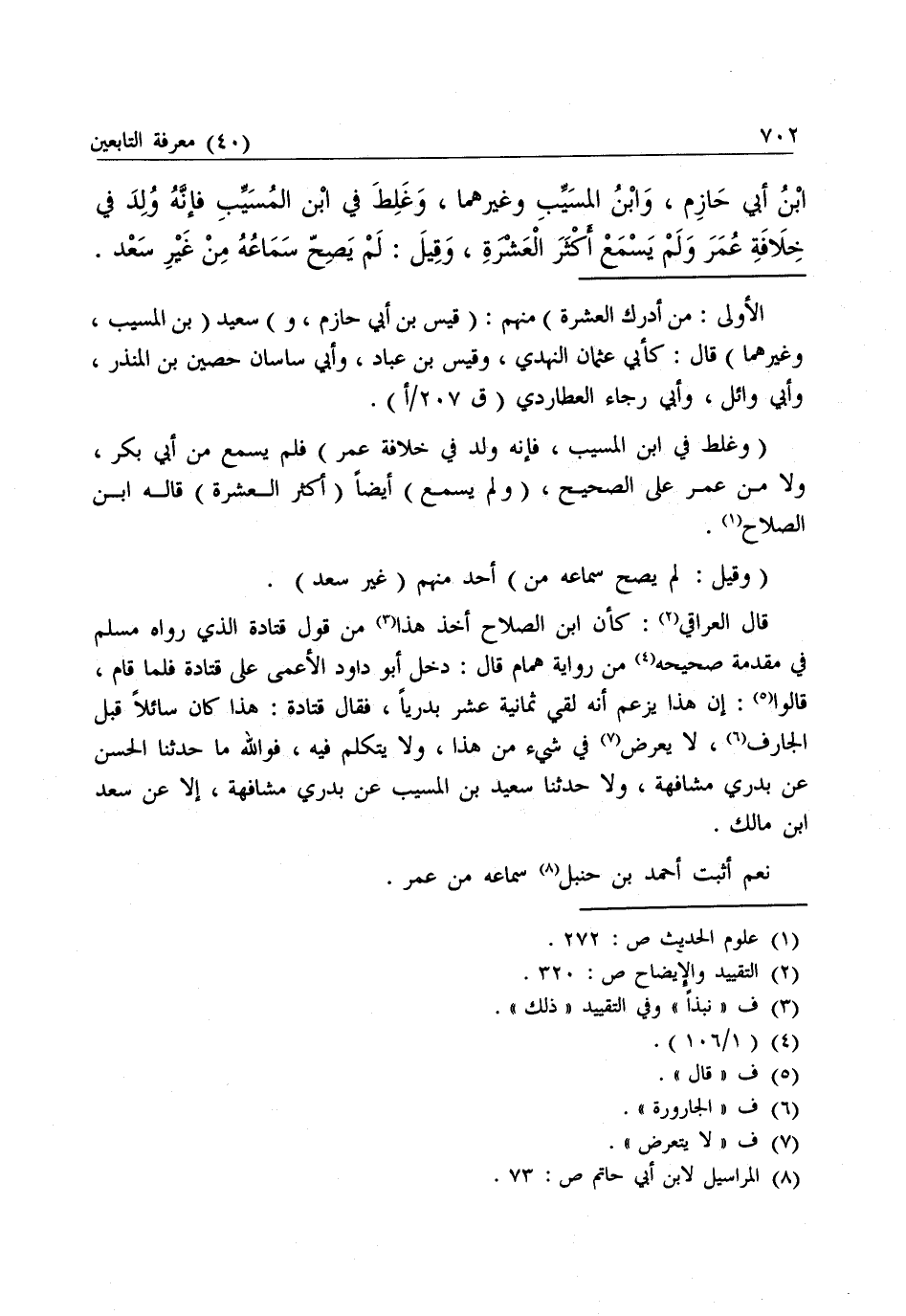 قَالَ الْعِرَاقِيُّ: كَأَنَّ ابْنَ الصَّلَاحِ أَخَذَ هَذَا مِنْ قَوْلِ قَتَادَةَ الَّذِي رَوَاهُ مُسْلِمٌ فِي مُقَدِّمَةِ صَحِيحِهِ مِنْ رِوَايَةِ هَمَّامٍ، قَالَ: دَخَلَ أَبُو دَاوُدَ الْأَعْمَى عَلَى قَتَادَةَ فَلَمَّا قَامَ، قَالُوا: إِنَّ هَذَا يَزْعُمُ أَنَّهُ لَقِيَ ثَمَانِيَةَ عَشَرَ بَدْرِيًّا، فَقَالَ قَتَادَةُ: هَذَا كَانَ سَائِلًا قَبْلَ الْجَارِفِ، لَا يَعْرِضُ فِي شَيْءٍ مِنْ هَذَا، وَلَا يَتَكَلَّمُ فِيهِ، فَوَاللَّهِ مَا حَدَّثَنَا الْحَسَنُ عَنْ بَدْرِيٍّ مُشَافَهَةً، وَلَا حَدَّثَنَا سَعِيدُ بْنُ الْمُسَيَّبِ عَنْ بَدْرِيٍّ مُشَافَهَةً، إِلَّا عَنْ سَعْدِ بْنِ مَالِكٍ.