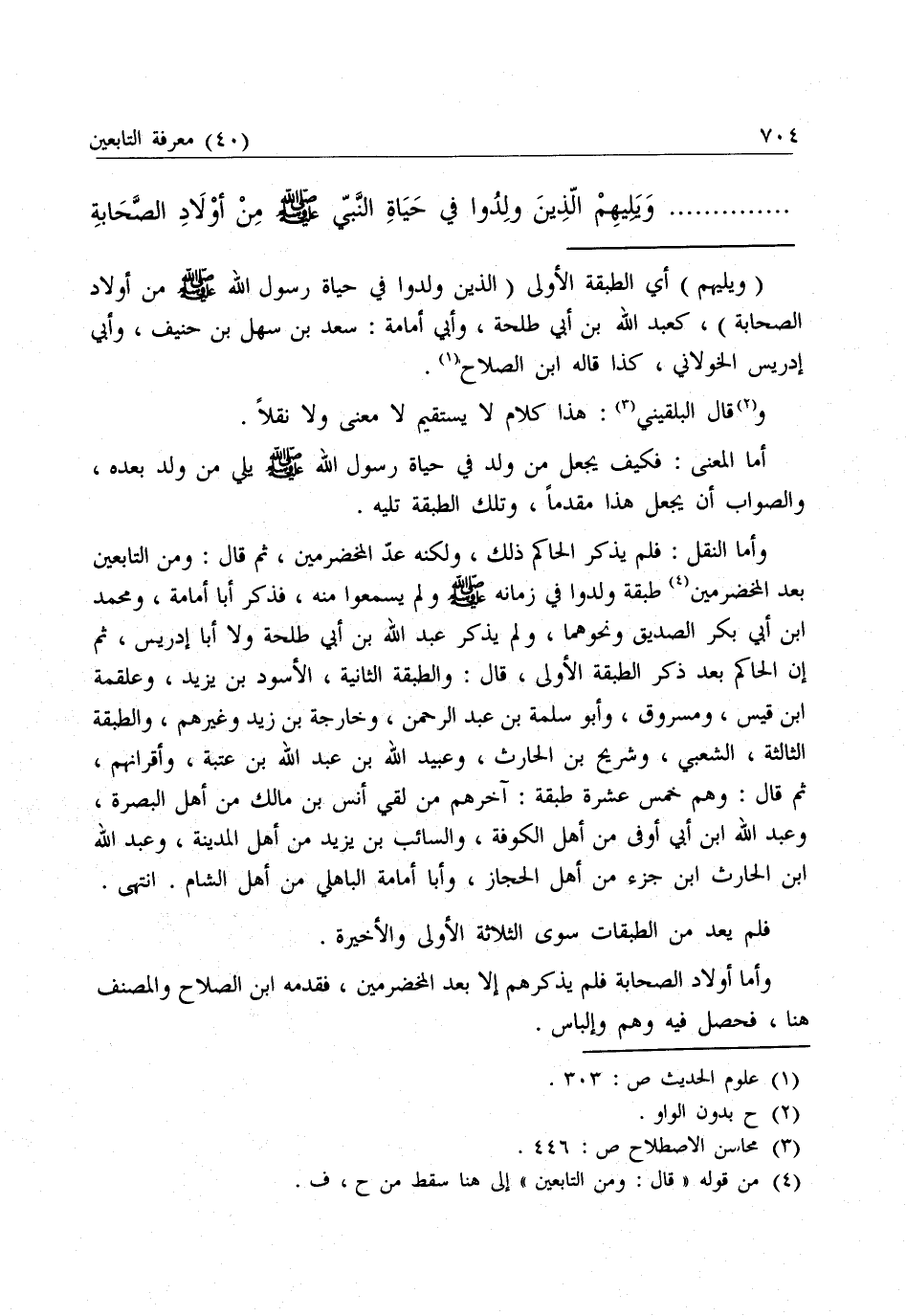 وَأَمَّا النَّقْلُ: فَلَمْ يَذْكُرِ الْحَاكِمُ ذَلِكَ، وَلَكِنَّهُ عَدَّ الْمُخَضْرَمِينَ ثُمَّ قَالَ: وَمِنَ التَّابِعِينَ بَعْدَ الْمُخَضْرَمِينَ طَبَقَةٌ وُلِدُوا فِي زَمَانِهِ - صَلَّى اللَّهُ عَلَيْهِ وَسَلَّمَ - وَلَمْ يَسْمَعُوا مِنْهُ، فَذَكَرَ أَبَا أُمَامَةَ وَمُحَمَّدَ بْنَ أَبِي بَكْرٍ الصِّدِّيقِ وَنَحْوَهُمَا، وَلَمْ يَذْكُرْ عَبْدَ اللَّهِ بْنَ أَبِي طَلْحَةَ وَلَا أَبَا إِدْرِيسَ، ثُمَّ إِنَّ الْحَاكِمَ بَعْدَ ذِكْرِ الطَّبَقَةِ الْأُولَى، قَالَ: وَالطَّبَقَةُ الثَّانِيَةُ: الْأَسْوَدُ بْنُ يَزِيدَ، وَعَلْقَمَةُ بْنُ قَيْسٍ، وَمَسْرُوقٌ، وَأَبُو سَلَمَةَ بْنُ عَبْدِ الرَّحْمَنِ، وَخَارِجَةُ بْنُ زَيْدٍ، وَغَيْرُهُمْ، وَالطَّبَقَةُ الثَّالِثَةُ: الشَّعْبِيُّ، وُشُرَيْحُ بْنُ الْحَارِثِ، وَعُبَيْدُ اللَّهِ بْنُ عَبْدِ اللَّهِ بْنِ عُتْبَةَ، وَأَقْرَانُهُمْ، ثُمَّ قَالَ: وَهُمْ خَمْسَ عَشْرَةَ طَبَقَةً: آخِرُهُمْ مَنْ لَقِيَ أَنَسَ بْنَ مَالِكٍ مِنْ أَهْلِ الْبَصْرَةِ، وَعَبْدَ اللَّهِ بْنَ أَبِي أَوْفَى مِنْ أَهْلِ الْكُوفَةِ، وَالسَّائِبَ بْنَ يَزِيدَ مِنْ أَهْلِ الْمَدِينَةِ، وَعَبْدَ اللَّهِ بْنَ الْحَارِثِ بْنِ جَزْءٍ مِنْ أَهْلِ الْحِجَازِ، وَأَبَا أُمَامَةَ الْبَاهِلِيَّ مِنْ أَهْلِ الشَّامِ، انْتَهَى.