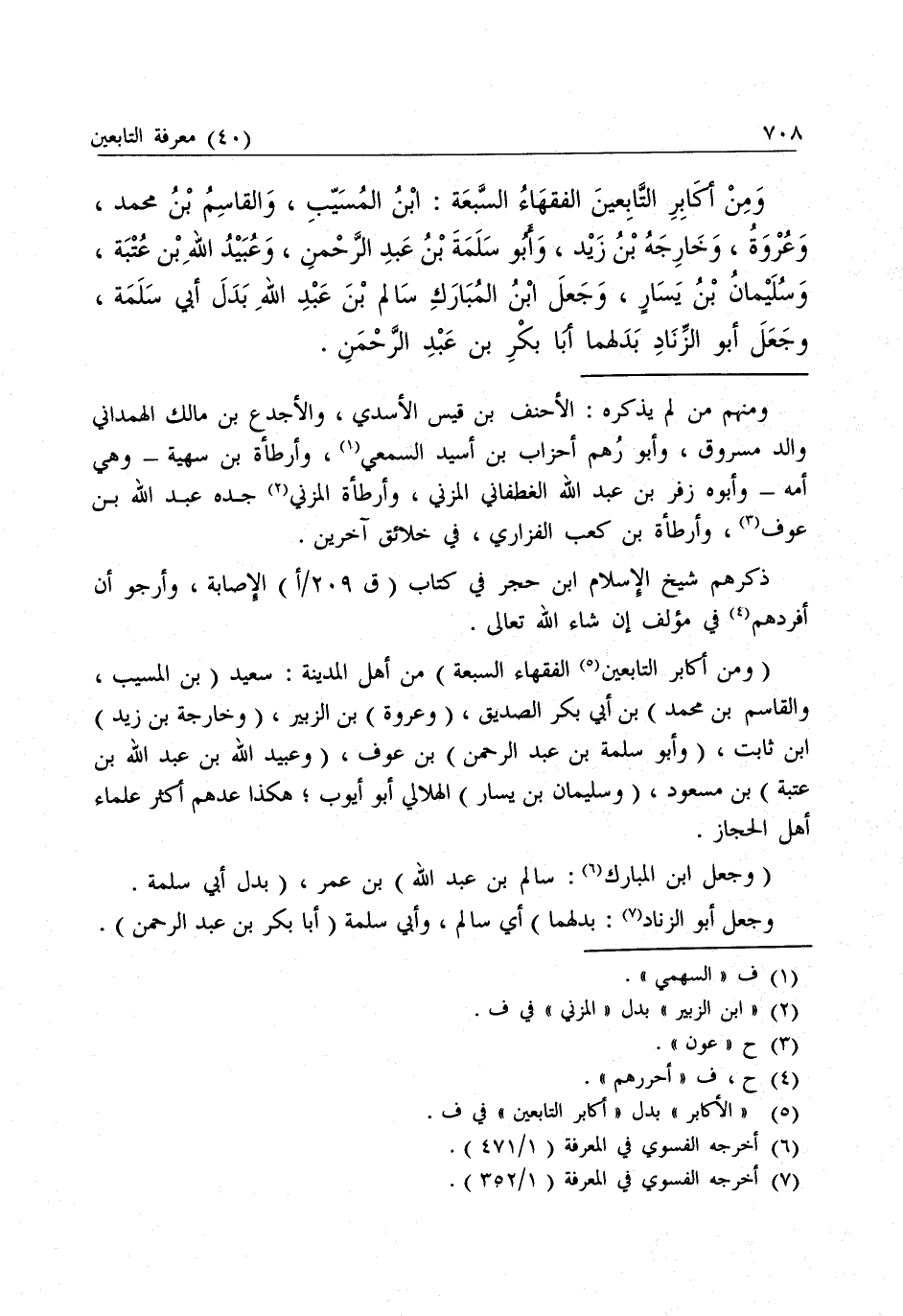(وَمِنْ أَكَابِرَ التَّابِعِينَ الْفُقَهَاءُ السَّبْعَةُ) مِنْ أَهْلِ الْمَدِينَةِ: سَعِيدُ (بْنُ الْمُسَيَّبِ، وَالْقَاسِمُ بْنُ مُحَمَّدِ) بْنِ أَبِي بَكْرٍ الصِّدِّيقِ، (وَعُرْوَةُ) بْنُ الزُّبَيْرِ، (وَخَارِجَةُ بْنُ زَيْدِ) بْنِ ثَابِتٍ، (وَأَبُو سَلَمَةَ بْنُ عَبْدِ الرَّحْمَنِ) بْنِ عَوْفٍ، (وَعُبَيْدُ اللَّهِ بْنُ عَبْدِ اللَّهِ بْنِ عُتْبَةَ) بْنِ مَسْعُودٍ، (وَسُلَيْمَانُ بْنُ يَسَارٍ) الْهِلَالِيُّ أَبُو أَيُّوبِ ; هَكَذَا عَدَّهُمْ أَكْثَرُ عُلَمَاءِ أَهْلِ الْحِجَازِ.