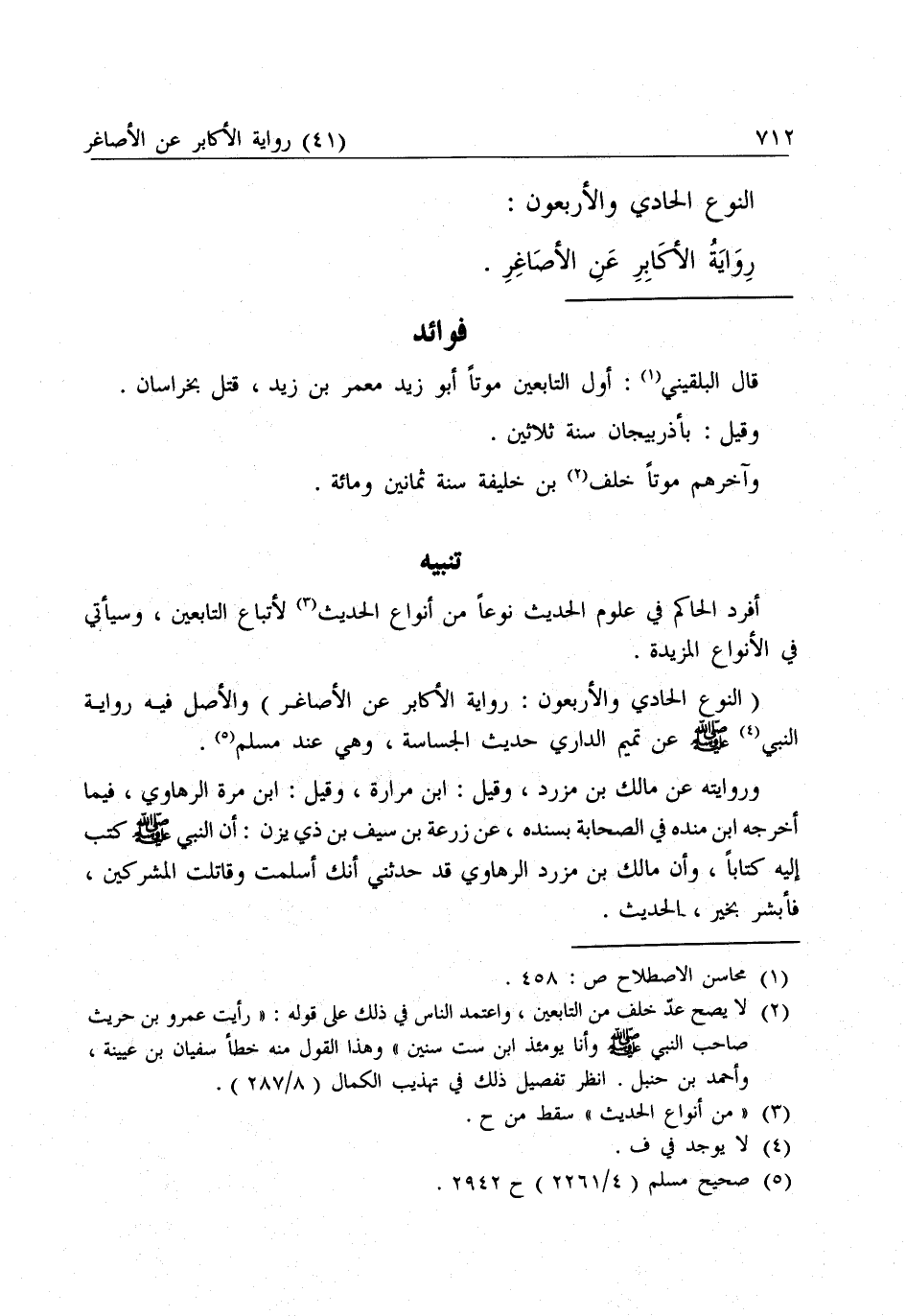 (النَّوْعُ الْحَادِي وَالْأَرْبَعُونَ: رِوَايَةُ الْأَكَابِرِ عَنِ الْأَصَاغِرِ) وَالْأَصْلُ فِيهِ رِوَايَةُ النَّبِيِّ - صَلَّى اللَّهُ عَلَيْهِ وَسَلَّمَ - عَنْ تَمِيمٍ الدَّارِيِّ حَدِيثَ الْجَسَّاسَةِ، وَهِيَ عِنْدَ مُسْلِمٍ.
