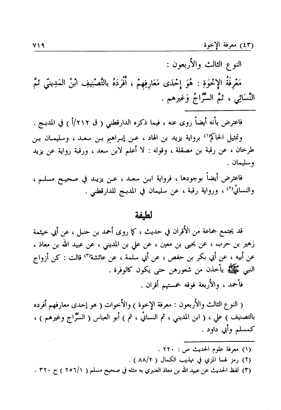 (النَّوْعُ الثَّالِثُ وَالْأَرْبَعُونَ: مَعْرِفَةُ الْإِخْوَةِ) وَالْأَخَوَاتِ (هُوَ إِحْدَى مَعَارِفِهِمْ أَفْرَدَهُ بِالتَّصْنِيفِ) عَلِيُّ (ابْنُ الْمَدِينِيِّ، ثُمَّ النَّسَائِيُّ، ثُمَّ) أَبُو الْعَبَّاسِ (السَّرَّاجُ، وَغَيْرُهُمْ) كَمُسْلِمٍ وَأَبِي دَاوُدَ.