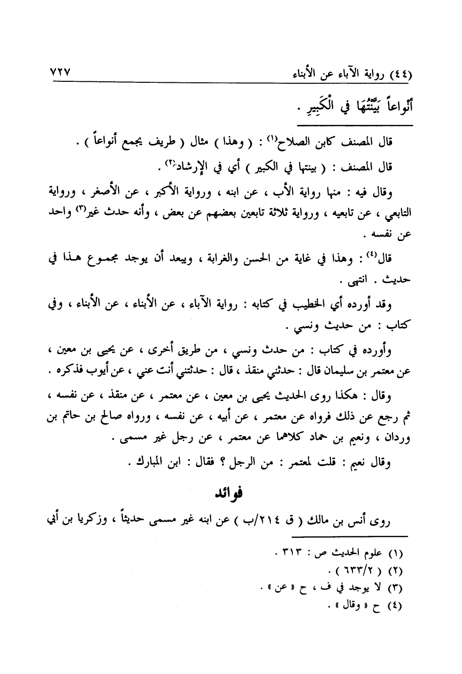 وَقَالَ فِيهِ: مِنْهَا رِوَايَةُ الْأَبِ عَنِ ابْنِهِ، وَرِوَايَةُ الْأَكْبَرِ عَنِ الْأَصْغَرِ، وَرِوَايَةُ التَّابِعِيِّ عَنْ تَابِعِيِّهِ، وَرِوَايَةُ ثَلَاثَةِ تَابِعِينَ بَعْضِهِمْ عَنْ بَعْضٍ، وَأَنَّهُ حَدَّثَ غَيْرُ وَاحِدٍ عَنْ نَفْسِهِ.