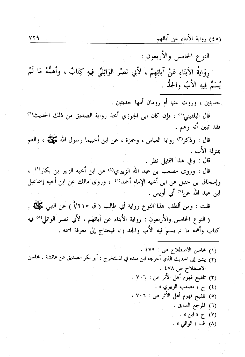 (النَّوْعُ الْخَامِسُ وَالْأَرْبَعُونَ: رِوَايَةُ الْأَبْنَاءِ عَنْ آبَائِهِمْ لِأَبِي نَصْرٍ الْوَائِلِيِّ، فِيهِ كِتَابٌ، وَأَهَمُّهُ مَا لَمْ يُسَمَّ فِيهِ الْأَبُ وَالْجَدُّ) فَيُحْتَاجُ إِلَى مَعْرِفَةِ اسْمِهِ.