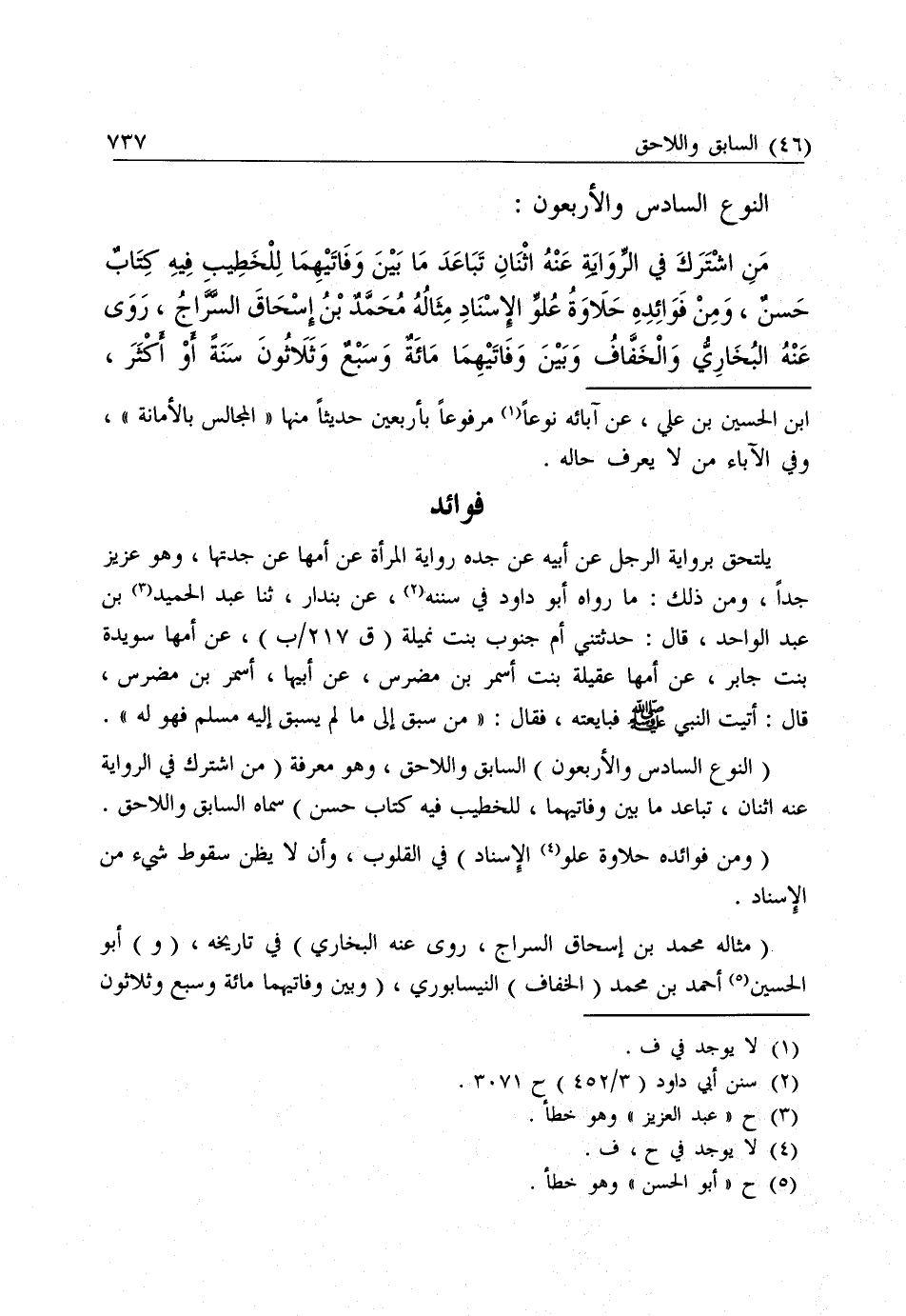 (النَّوْعُ السَّادِسُ وَالْأَرْبَعُونَ) السَّابِقُ وَاللَّاحِقُ، وَهُوَ مَعْرِفَةُ (مَنِ اشْتَرَكَ فِي الرِّوَايَةِ عَنْهُ اثْنَانِ تَبَاعَدَ مَا بَيْنَ وَفَاتَيْهِمَا، لِلْخَطِيبِ فِيهِ كِتَابٌ حَسَنٌ) سَمَّاهُ: السَّابِقُ وَاللَّاحِقُ.