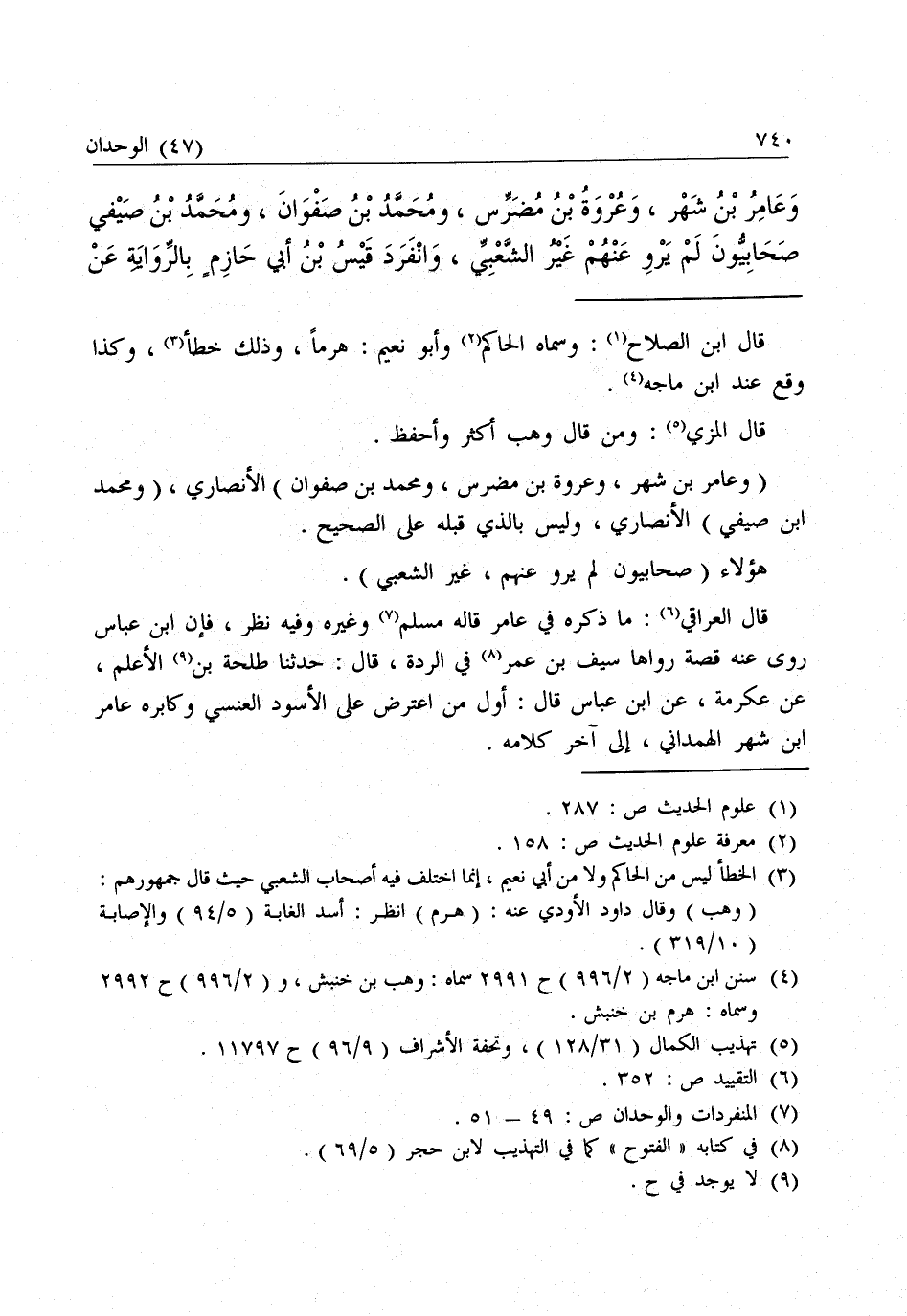قَالَ الْعِرَاقِيُّ: مَا ذَكَرَهُ فِي عَامِرٍ قَالَهُ مُسْلِمٌ وَغَيْرُهُ وَفِيهِ نَظَرٌ، فَإِنَّ ابْنَ عَبَّاسٍ رَوَى عَنْهُ قِصَّةً رَوَاهَا سَيْفُ بْنُ عُمَرَ فِي الرِّدَّةِ، قَالَ: حَدَّثَنَا طَلْحَةُ الْأَعْلَمُ، عَنْ عِكْرِمَةَ، عَنِ ابْنِ عَبَّاسٍ قَالَ: أَوَّلُ مَنِ اعْتَرَضَ عَلَى الْأَسْوَدِ الْعَنْسِيِّ وَكَابَرَهُ عَامِرُ بْنُ شَهْرٍ الْهَمْدَانِيُّ، إِلَى آخِرَ كَلَامِهِ.