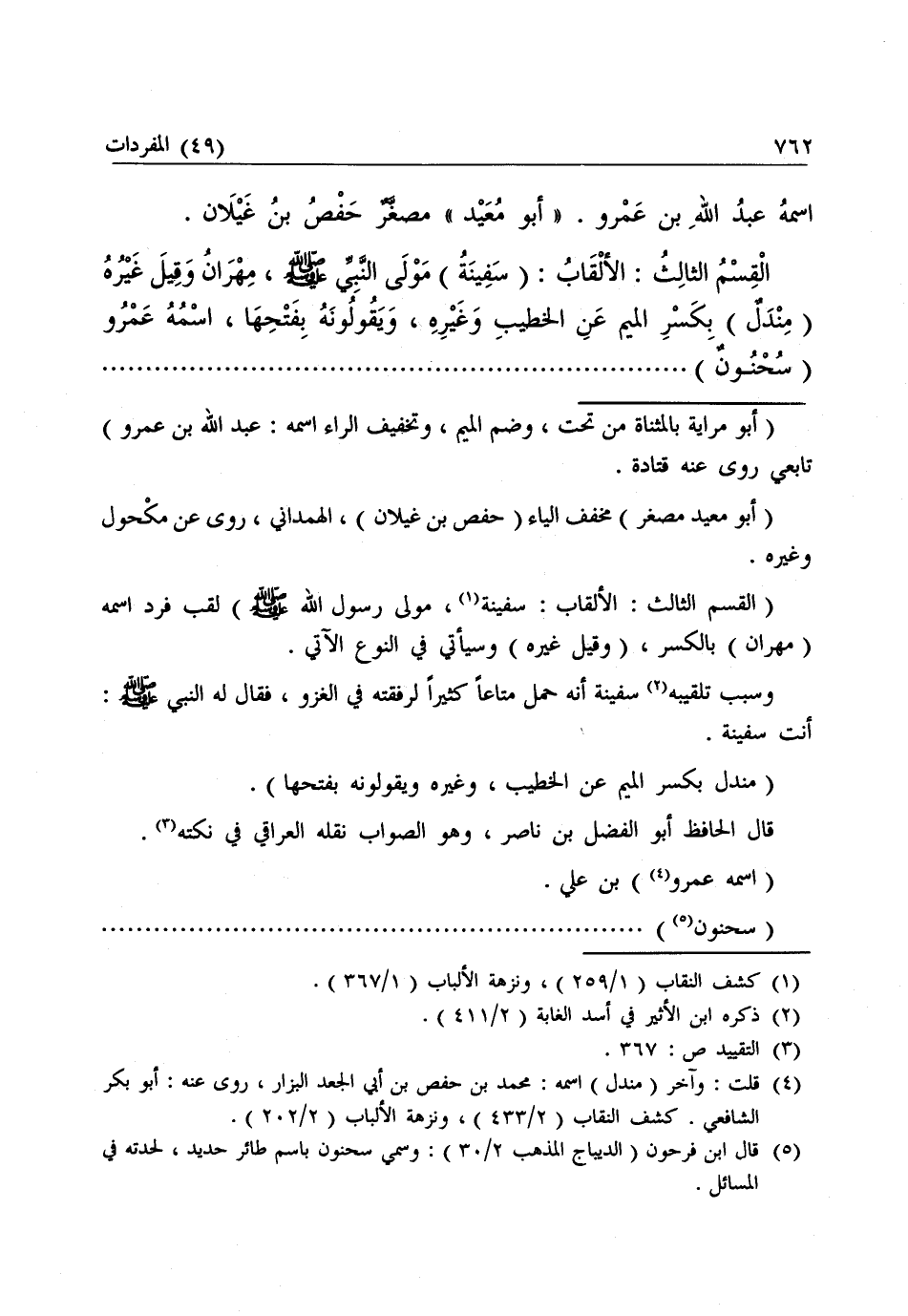 (الْقِسْمُ الثَّالِثُ: الْأَلْقَابُ: سَفِينَةُ، مَوْلَى رَسُولِ اللَّهِ - صَلَّى اللَّهُ عَلَيْهِ وَسَلَّمَ -) لَقَبُ فَرْدٍ اسْمُهُ (مِهْرَانُ) بِالْكَسْرِ، (وَقِيلَ غَيْرُهُ) وَسَيَأْتِي فِي النَّوْعِ الْآتِي.