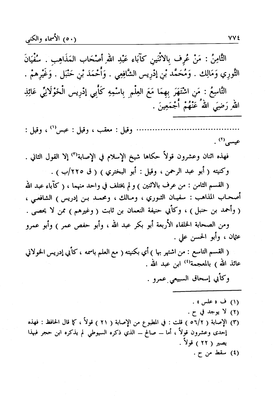 وَمِنَ الصَّحَابَةِ الْخُلَفَاءُ الْأَرْبَعَةُ أَبُو بَكْرٍ عَبْدُ اللَّهِ، وَأَبُو حَفْصٍ عُمَرُ) وَأَبُو عَمْرٍو عُثْمَانُ، وَأَبُو الْحَسَنِ عَلِيٌّ.