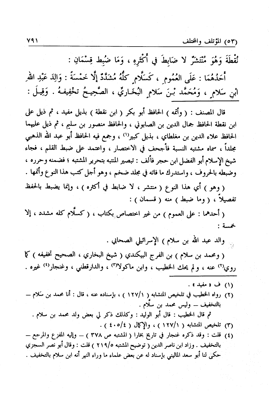 ـــــــــــــــــــــــــــــQقَالَ الْمُصَنِّفُ (وَأَتَمَّهُ) الْحَافِظُ أَبُو بَكْرِ (بْنُ نُقْطَةَ) بِذَيْلٍ مُفِيدٍ، ثُمَّ ذَيَّلَ عَلَى ابْنِ نُقْطَةَ الْحَافِظُ جَمَالُ الدِّينِ بْنُ الصَّابُونِيِّ، وَالْحَافِظُ مَنْصُورُ بْنُ سُلَيْمٍ، ثُمَّ ذَيَّلَ عَلَيْهِمَا الْحَافِظُ عَلَاءُ الدِّينِ بْنُ مُغْلَطَايْ، بِذَيْلٍ كَبِيرٍ، وَجَمَعَ فِيهِ الْحَافِظُ أَبُو عَبْدِ اللَّهِ الذَّهَبِيُّ مُجَلَّدًا، سَمَّاهُ: " مُشْتَبِهُ النِّسْبَةِ "، فَأَجْحَفَ فِي الِاخْتِصَارِ، وَاعْتَمَدَ عَلَى ضَبْطِ الْقَلَمِ، فَجَاءَ شَيْخُ الْإِسْلَامِ أَبُو الْفَضْلِ بْنُ حَجَرٍ فَأَلَّفَ " تَبْصِيرُ الْمُنْتَبِهِ بِتَحْرِيرِ الْمُشْتَبِهِ "، فَضَمَّنَهُ وَحَرَّرَهُ وَضَبَطَهُ بِالْحُرُوفِ، وَاسْتَدْرَكَ مَا فَاتَهُ فِي مُجَلَّدٍ ضَخْمٍ، وَهُوَ أَجَلُّ كُتُبِ هَذَا النَّوْعِ وَأَتَمُّهَا.