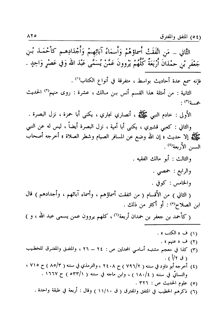 الثَّانِي - مَنِ اتَّفَقَتْ أَسْمَاؤُهُمْ وَأَسْمَاءُ آبَائِهِمْ وَأَجْدَادِهِمْ كَأَحْمَدَ بْنِ جَعْفَرِ بْنِ حَمْدَانَ أَرْبَعَةٌ كُلُّهُمْ يَرْوُونَ عَمَّنْ يُسَمَّى عَبْدَ اللَّهِ وَفِي عَصْرٍ وَاحِدٍ.
