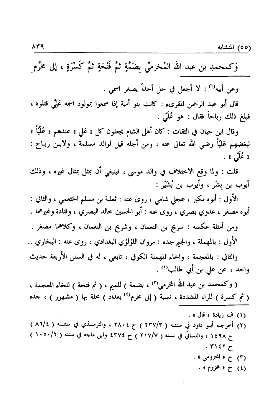 (وَكَمُحَمَّدِ بْنِ عَبْدِ اللَّهِ الْمُخَرِّمِيِّ، بِضَمَّةٍ) لِلْمِيمِ (ثُمَّ فَتْحَةٍ) لِلْخَاءِ الْمُعْجَمَةِ، (ثُمَّ كَسْرَةٍ) لِلرَّاءِ الْمُشَدَّدَةِ، نِسْبَةً (إِلَى مُخَرِّمِ بَغْدَادَ) مَحَلَّةٍ بِهَا (مَشْهُورٌ) جَدُّهُ