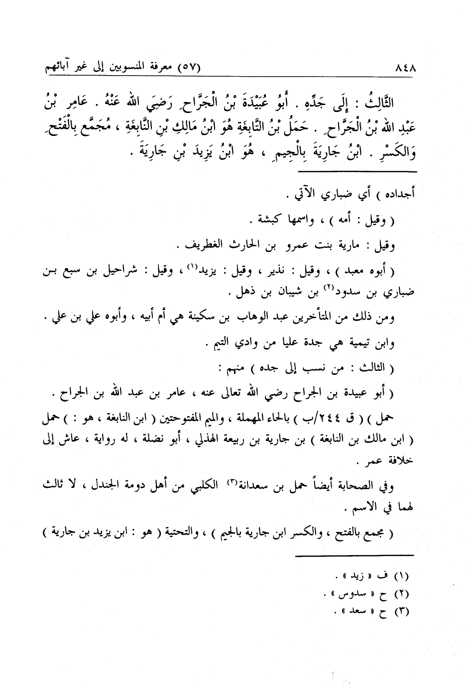 (الثَّالِثُ: مَنْ نُسِبَ إِلَى جَدِّهِ) مِنْهُمْ: (أَبُو عُبَيْدَةَ بْنُ الْجَرَّاحِ - رَضِيَ اللَّهُ تَعَالَى عَنْهُ - عَامِرُ بْنُ عَبْدِ اللَّهِ بْنِ الْجَرَّاحِ.