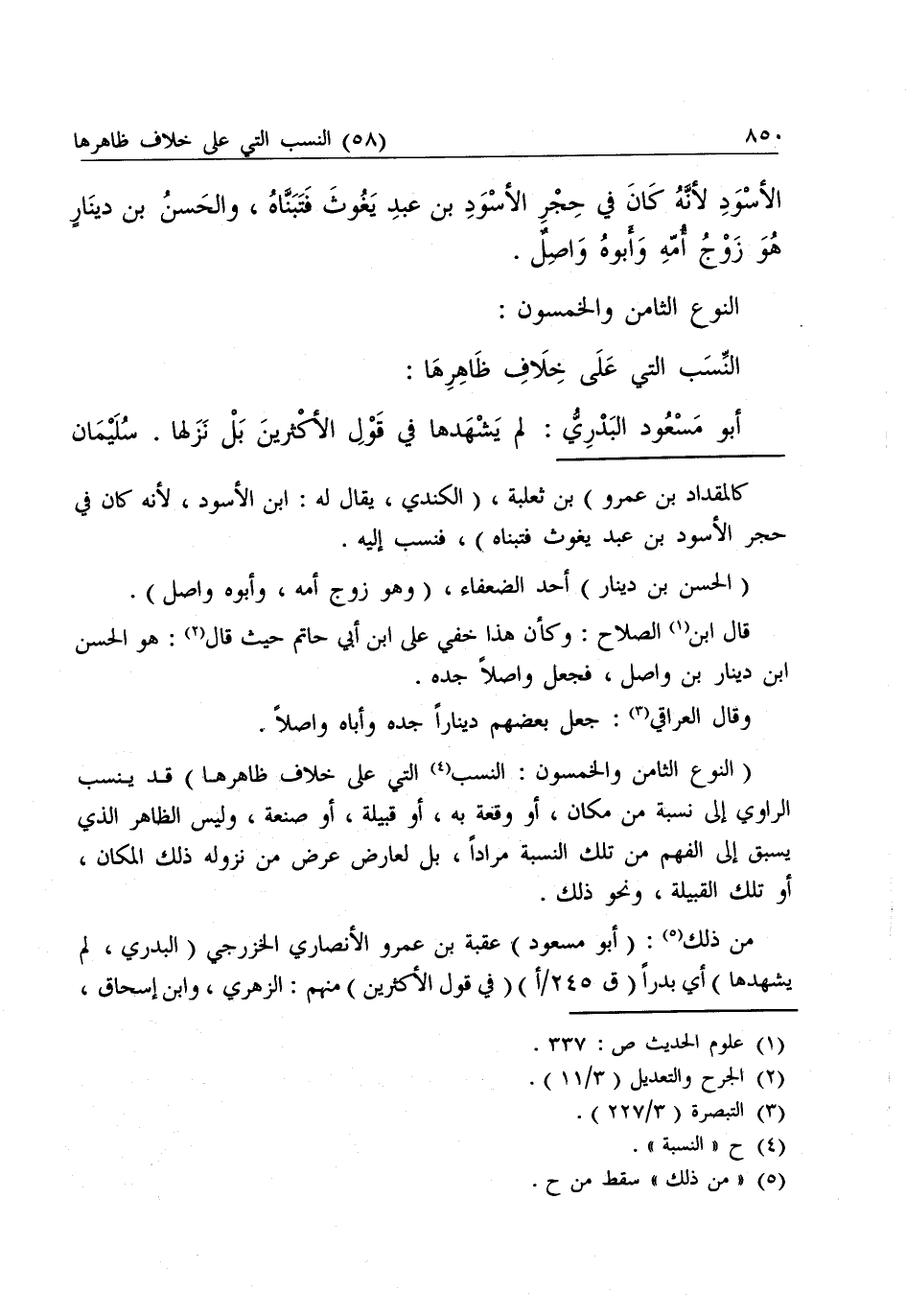 (النَّوْعُ الثَّامِنُ وَالْخَمْسُونَ: النِّسَبُ الَّتِي عَلَى خِلَافِ ظَاهِرِهَا) قَدْ يُنْسَبُ الرَّاوِي إِلَى نِسْبَةٍ مِنْ مَكَانٍ، أَوْ وَقْعَةٍ بِهِ، أَوْ قَبِيلَةٍ، أَوْ صَنْعَةٍ، وَلَيْسَ الظَّاهِرُ الَّذِي يَسْبِقُ إِلَى الْفَهْمِ مِنْ تِلْكَ النِّسْبَةِ مُرَادًا، بَلْ لِعَارِضٍ عَرَضَ مِنْ نُزُولِهِ ذَلِكَ الْمَكَانَ، أَوْ تِلْكَ الْقَبِيلَةَ وَنَحْوَ ذَلِكَ.