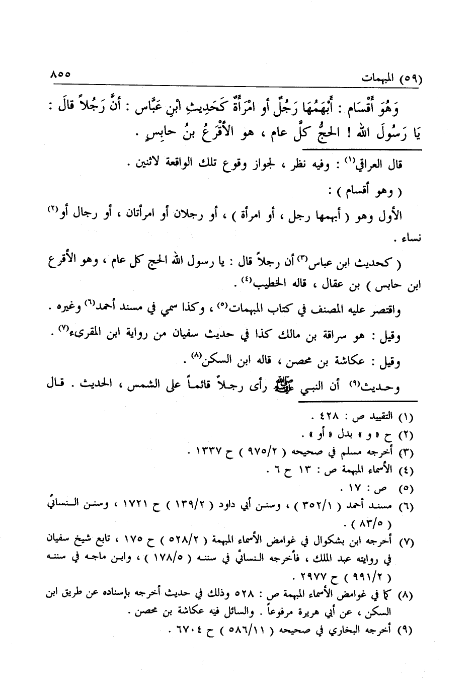 وَهُوَ أَقْسَامٌ: أَبْهَمُهَا رَجُلٌ أَوِ امْرَأَةٌ، كَحَدِيثِ ابْنِ عَبَّاسٍ: «أَنَّ رَجُلًا قَالَ يَا رَسُولَ اللَّهِ، الْحَجُّ كُلَّ عَامٍ» ، هُوَ الْأَقْرَعُ بْنُ حَابِسٍ