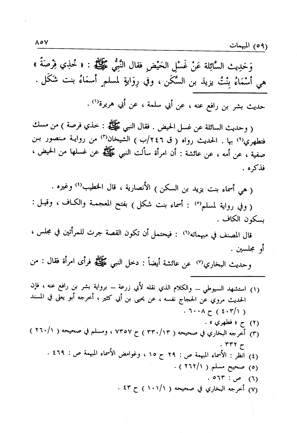 (وَحَدِيثُ السَّائِلَةِ عَنْ غُسْلِ الْحَيْضِ. فَقَالَ النَّبِيُّ - صَلَّى اللَّهُ عَلَيْهِ وَسَلَّمَ: «خُذِي فِرْصَةً) مِنْ مِسْكٍ فَتَطَهَّرِي بِهَا» . الْحَدِيثُ رَوَاهُ الشَّيْخَانِ مِنْ رِوَايَةِ مَنْصُورِ بْنِ صَفِيَّةَ، عَنْ أُمِّهِ، عَنْ عَائِشَةَ: «أَنَّ امْرَأَةً سَأَلَتِ النَّبِيَّ - صَلَّى اللَّهُ عَلَيْهِ وَسَلَّمَ - عَنْ غُسْلِهَا مِنَ الْحَيْضِ» فَذَكَرَهُ.