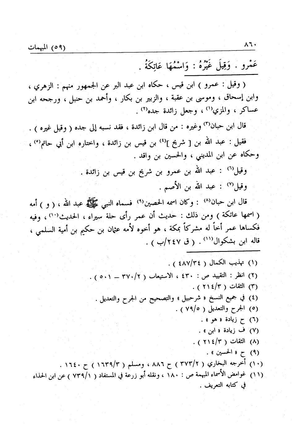 قَالَ ابْنُ حِبَّانَ: «وَكَانَ اسْمُهُ الْحُصَيْنَ فَسَمَّاهُ النَّبِيُّ - صَلَّى اللَّهُ عَلَيْهِ وَسَلَّمَ - عَبْدَ اللَّهِ» ، (وَ) أُمُّهُ (اسْمُهَا عَاتِكَةُ) ، وَمِنْ ذَلِكَ: حَدِيثُ أَنَّ عُمَرَ رَأَى حُلَّةً سِيَرَاءَ، الْحَدِيثَ، وَفِيهِ فَكَسَاهَا عُمَرُ أَخًا لَهُ مُشْرِكًا بِمَكَّةَ، هُوَ أَخُوهُ لِأُمِّهِ عُثْمَانُ بْنُ حَكِيمِ بْنِ أُمَيَّةَ السُّلَمِيُّ، قَالَهُ ابْنُ بَشْكُوالَ.