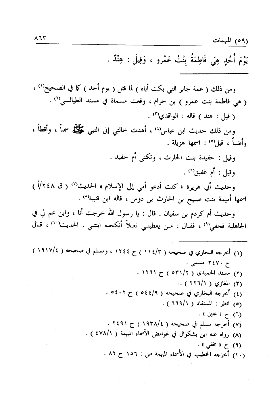 ـــــــــــــــــــــــــــــQوَمِنْ ذَلِكَ (عَمَّةُ جَابِرٍ الَّتِي بَكَتْ أَبَاهُ) لَمَّا قُتِلَ (يَوْمَ أُحُدٍ) كَمَا فِي الصَّحِيحِ، (هِيَ فَاطِمَةُ بِنْتُ عَمْرِو) بْنِ حَرَامٍ، وَقَعَتْ مُسَمَّاةً فِي مُسْنَدِ الطَّيَالِسِيِّ.