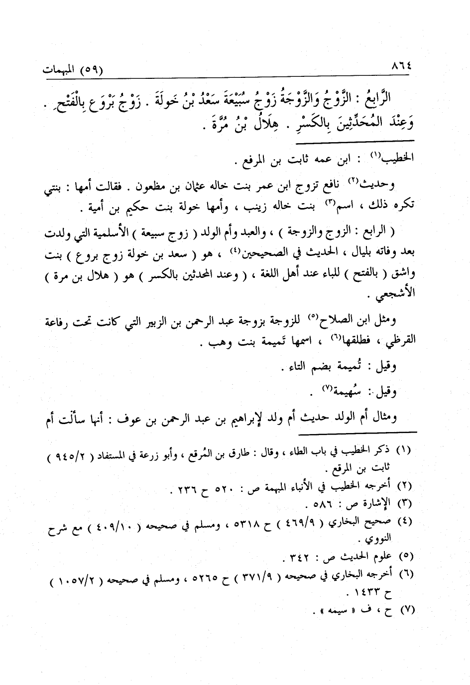 وَمَثَّلَ ابْنُ الصَّلَاحِ لِلزَّوْجَةِ بِزَوْجَةِ عَبْدِ الرَّحْمَنِ بْنِ الزُّبَيْرِ الَّتِي كَانَتْ تَحْتَ رِفَاعَةَ الْقُرَظِيِّ، فَطَلَّقَهَا، اسْمُهَا تَمِيمَةُ بِنْتُ وَهْبٍ.