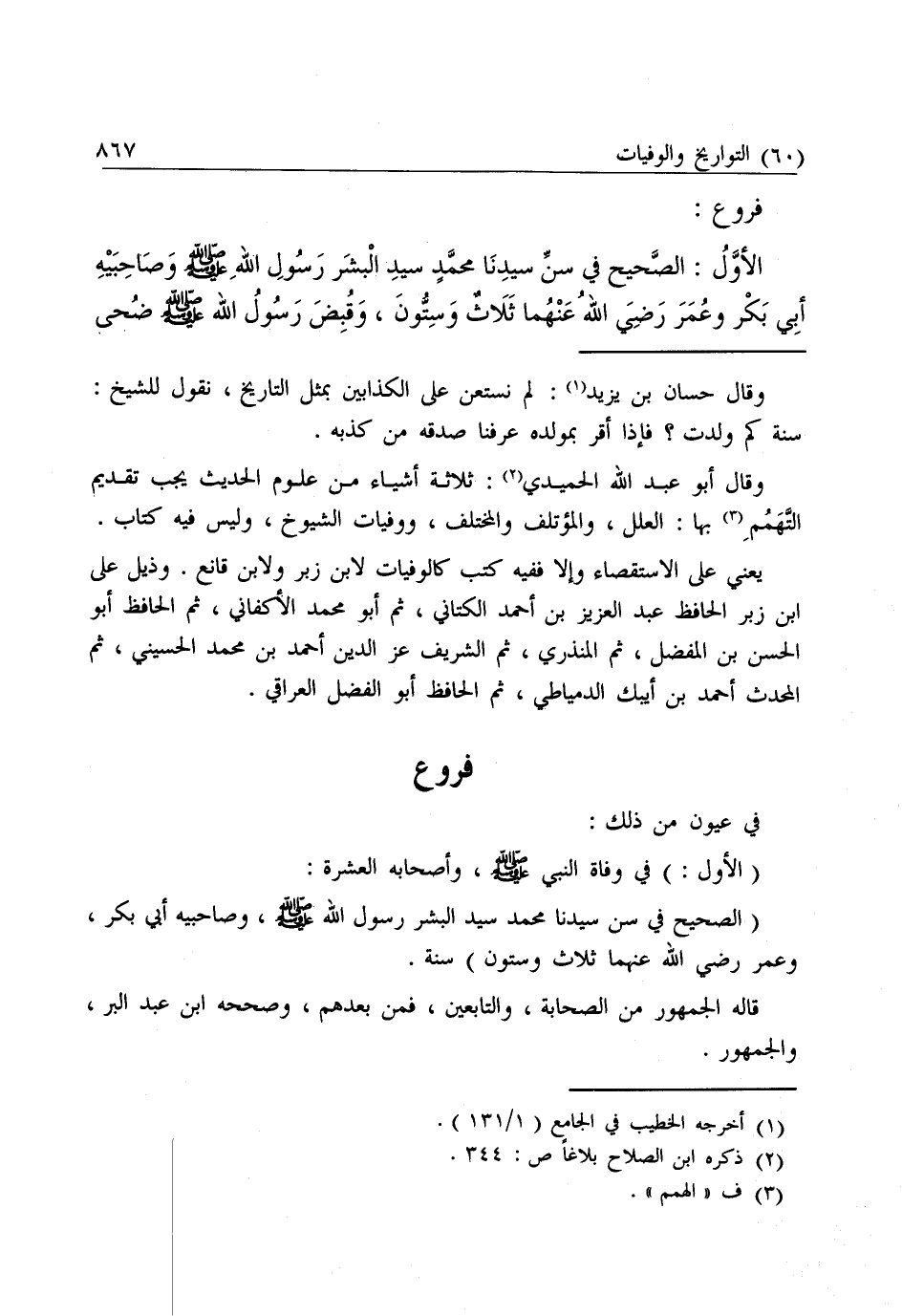 (الصَّحِيحُ فِي سِنِّ سَيِّدِنَا مُحَمَّدٍ سَيِّدِ الْبَشَرِ رَسُولِ اللَّهِ - صَلَّى اللَّهُ عَلَيْهِ وَسَلَّمَ - وَصَاحِبَيْهِ أَبِي بَكْرٍ، وَعُمَرَ - رَضِيَ اللَّهُ عَنْهُمَا - ثَلَاثٌ وَسِتُّونَ) سَنَةً.