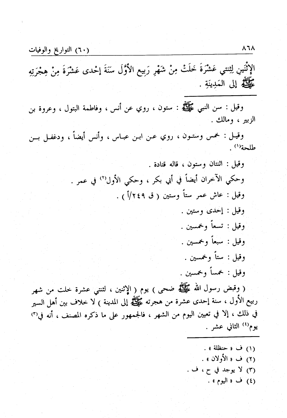 ـــــــــــــــــــــــــــــQوَقِيلَ: سِنُّ النَّبِيِّ - صَلَّى اللَّهُ عَلَيْهِ وَسَلَّمَ - سِتُّونَ، رُوِيَ عَنْ أَنَسٍ، وَفَاطِمَةَ الْبَتُولِ، وَعُرْوَةَ بْنِ الزُّبَيْرِ، وَمَالِكٍ.