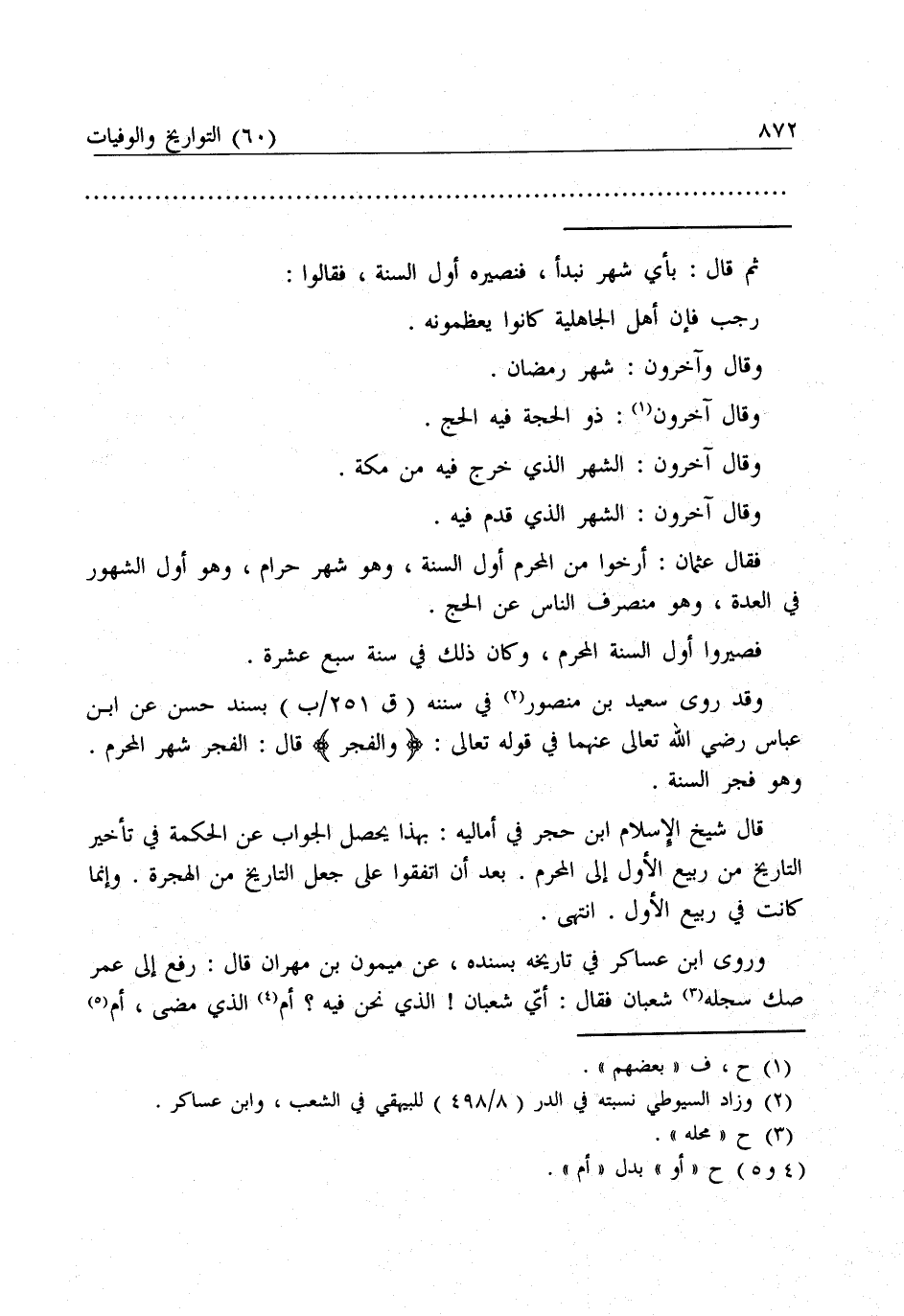 فَقَالَ عُثْمَانُ: أَرِّخُوا مِنَ الْمُحَرَّمِ أَوَّلَ السَّنَةِ، وَهُوَ شَهْرٌ حَرَامٌ، وَهُوَ أَوَّلُ الشُّهُورِ فِي الْعِدَّةِ، وَهُوَ مُنْصَرَفُ النَّاسِ عَنِ الْحَجِّ.