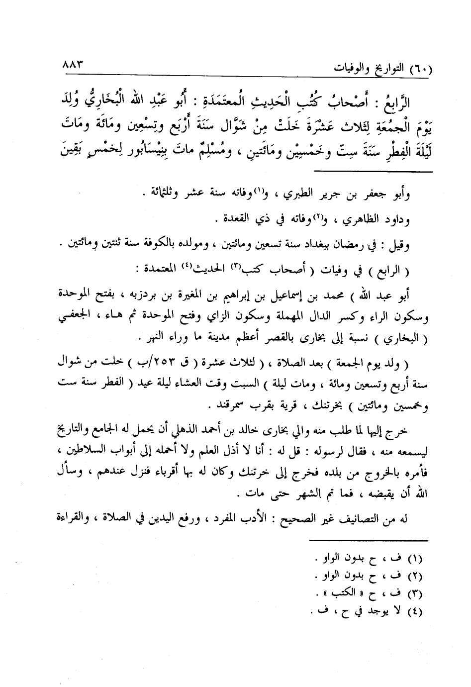 الرَّابِعُ: أَصْحَابُ كُتُبِ الْحَدِيثِ الْمُعْتَمَدَةِ: أَبُو عَبْدِ اللَّهِ الْبُخَارِيُّ وُلِدَ يَوْمَ الْجَمْعَةِ لِثَلَاثَ عَشْرَةَ خَلَتْ مِنْ شَوَّالٍ سَنَةَ أَرْبَعٍ وَتِسْعِينَ وَمَائَةٍ، وَمَاتَ لَيْلَةَ الْفِطْرِ سَنَةَ سِتٍّ وَخَمْسِينَ وَمِائَتَيْنِ، وَمُسْلِمٌ مَاتَ بِنَيْسَابُورَ لِخِمْسٍ بَقِينَ مِنْ رَجَبٍ سَنَةَ إِحْدًى وَسِتِّينَ وَمِائَتَيْنِ، ابْنُ خَمْسٍ وَخَمْسِينَ.