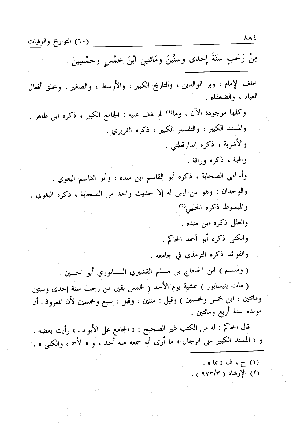 (مَاتَ بِنَيْسَابُورَ) عَشِيَّةَ يَوْمِ الْأَحَدِ (لِخَمْسٍ بَقِينَ مِنْ رَجَبٍ سَنَةَ إِحْدًى وَسِتِّينَ وَمِائَتَيْنِ، ابْنَ خَمْسٍ وَخَمْسِينَ) وَقِيلَ: سِتِّينَ، وَقِيلَ: سَبْعٍ وَخَمْسِينَ؛ لِأَنَّ الْمَعْرُوفَ أَنَّ مَوْلِدَهُ سَنَةَ أَرْبَعٍ وَمِائَتَيْنِ.