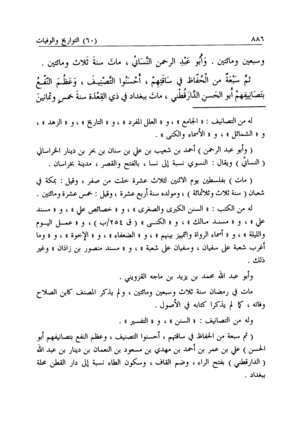 (وَأَبُو عَبْدِ الرَّحْمَنِ) أَحْمَدُ بْنُ شُعَيْبِ بْنِ عَلِيِّ بْنِ سِنَانَ بْنِ بَحْرِ بْنِ دِينَارٍ الْخُرَاسَانِيُّ (النَّسَائِيُّ) وَيُقَالُ: النَّسَوِيُّ نِسْبَةً إِلَى نَسَا، بِالْفَتْحِ وَالْقَصْرِ، مَدِينَةٌ بِخُرَاسَانَ.