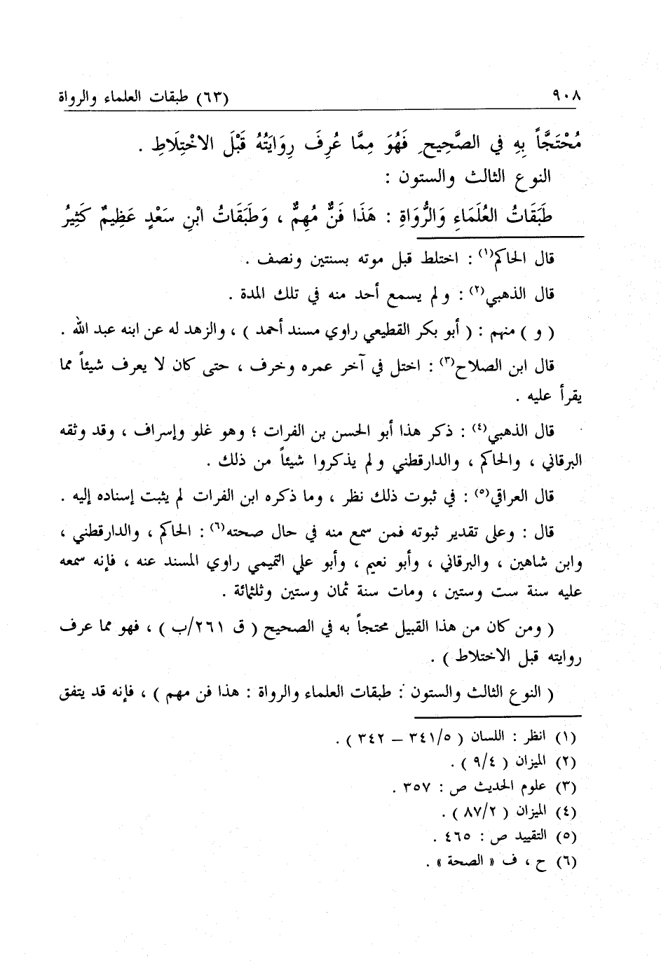 طَبَقَاتُ الْعُلَمَاءِ وَالرُّوَاةِ: هَذَا فَنٌّ مُهِمٌّ، وَطَبَقَاتُ ابْنِ سَعْدٍ عَظِيمٌ كَثِيرُ الْفَوَائِدَ، وَهُوَ ثِقَةٌ لِكِنَّهُ كَثِيرُ الرِّوَايَةِ فِيهِ عَنِ الضُّعَفَاءِ، مِنْهُمْ شَيْخُهُ مُحَمَّدُ بْنُ عُمَرَ الْوَاقِدِيُّ لَا يَنْسِبَهُ. وَالطَّبَقَةُ: الْقَوْمُ الْمُتَشَابِهُونَ، وَقَدْ يَكُونَانِ مِنْ طَبَقَةٍ بِاعْتِبَارٍ وَمِنْ طَبَقَتَيْنِ بِاعْتِبَارٍ كَأَنَسٍ وَشِبْهِهِ مِنْ أَصَاغِرِ الصَّحَابَةِ، وَهُمْ مَعَ الْعَشْرَةِ فِي طَبَقَةِ الصَّحَابَةِ، وَعَلَى هَذَا الصَّحَابَةُ كُلُّهُمْ طَبَقَةٌ، وَالتَّابِعُونَ ثَانِيَةٌ، وَأَتْبَاعُهُمْ ثَالِثَةٌ، وَهَلُمَّ جَرًّا، وَبِاعْتِبَارِ السَّوَابِقِ تَكُونُ الصَّحَابَةُ بِضْعَ عَشَرَةَ طَبَقَةً كَمَا تَقَدَّمَ، وَيَحْتَاجُ النَّاظِرُ فِيهِ إِلَى مَعْرِفَةِ الْمَوَالِيدِ وَالْوَفَيَاتِ، وَمَنْ رَوُوا عَنْهُ وَرَوَى عَنْهُمْ.